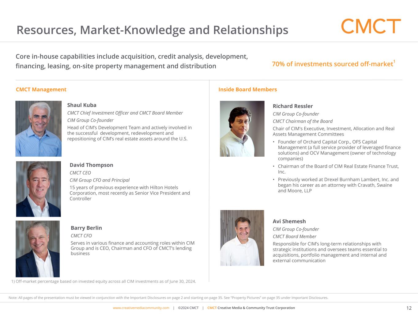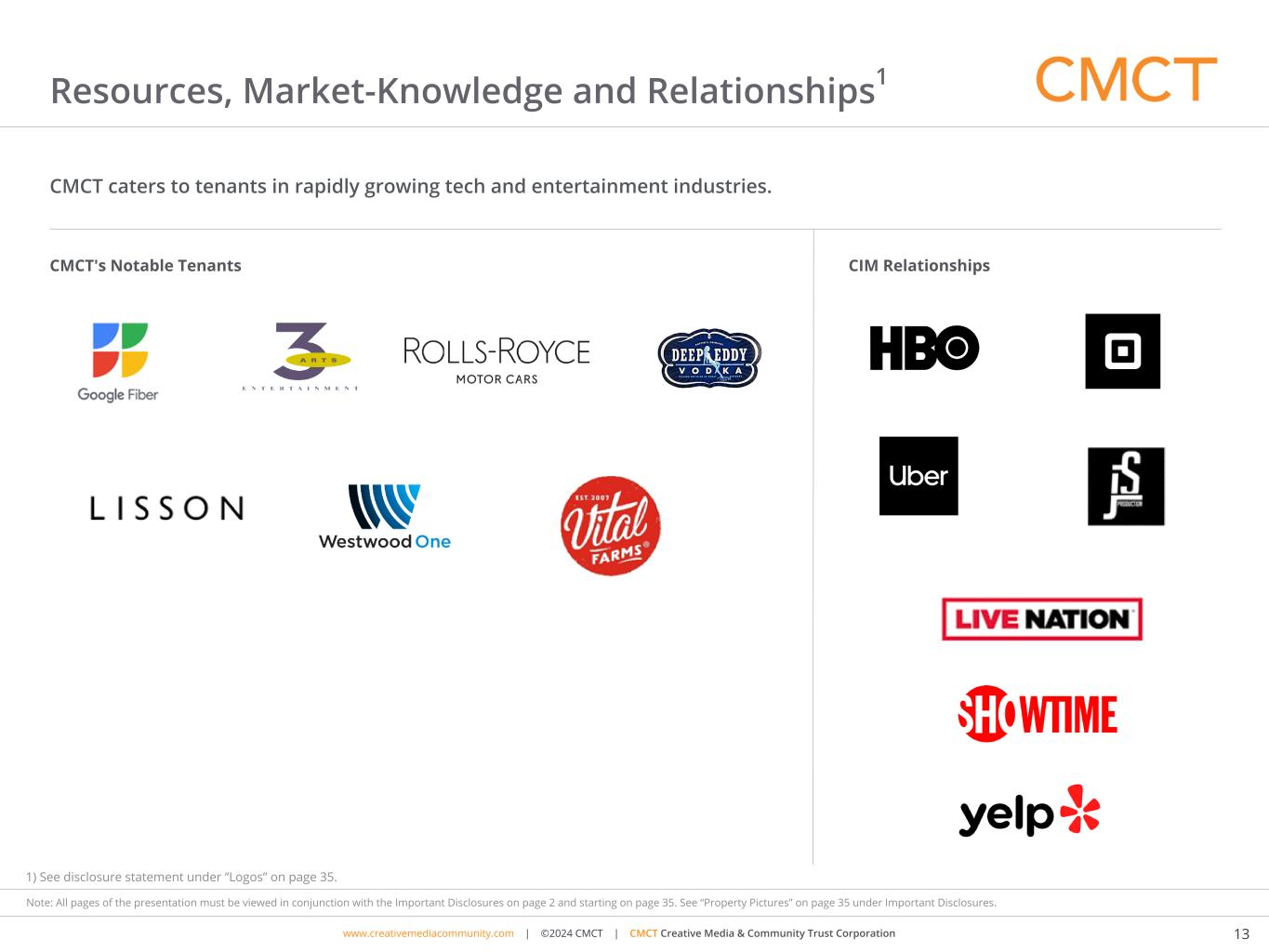 www.cimgroup.com | ©2018 CIM Group | TRADE SECRET / CONFIDENTIAL INFORMATIONwww.creativemediacommunity.com | ©2024 CMCT | CMCT Creative Media & Community Trust Corporation 12 Note: All pages of the presentation must be viewed in conjunction with the Important Disclosures on page 2 and starting on page 35. See “Property Pictures” on page 35 under Important Disclosures. Resources, Market-Knowledge and Relationships Core in-house capabilities include acquisition, credit analysis, development, financing, leasing, on-site property management and distribution CMCT Management 1) Off-market percentage based on invested equity across all CIM investments as of June 30, 2024. Inside Board Members Barry Berlin CMCT CFO Serves in various finance and accounting roles within CIM Group and is CEO, Chairman and CFO of CMCT’s lending business Avi Shemesh CIM Group Co-founder CMCT Board Member Responsible for CIM’s long-term relationships with strategic institutions and oversees teams essential to acquisitions, portfolio management and internal and external communication Richard Ressler CIM Group Co-founder CMCT Chairman of the Board Chair of CIM's Executive, Investment, Allocation and Real Assets Management Committees • Founder of Orchard Capital Corp., OFS Capital Management (a full service provider of leveraged finance solutions) and OCV Management (owner of technology companies) • Chairman of the Board of CIM Real Estate Finance Trust, Inc. • Previously worked at Drexel Burnham Lambert, Inc. and began his career as an attorney with Cravath, Swaine and Moore, LLP 70% of investments sourced off-market1 Shaul Kuba CMCT Chief Investment Officer and CMCT Board Member CIM Group Co-founder Head of CIM’s Development Team and actively involved in the successful development, redevelopment and repositioning of CIM’s real estate assets around the U.S. David Thompson CMCT CEO CIM Group CFO and Principal 15 years of previous experience with Hilton Hotels Corporation, most recently as Senior Vice President and Controller