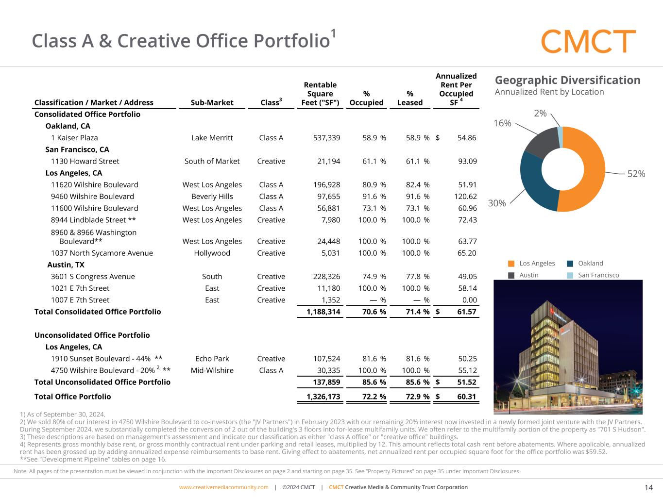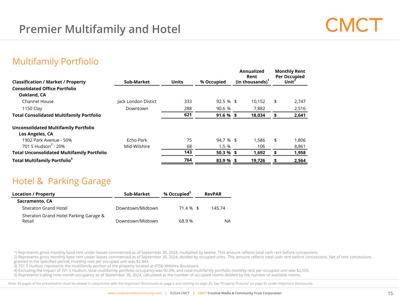 www.cimgroup.com | ©2018 CIM Group | TRADE SECRET / CONFIDENTIAL INFORMATIONwww.creativemediacommunity.com | ©2024 CMCT | CMCT Creative Media & Community Trust Corporation 14 Note: All pages of the presentation must be viewed in conjunction with the Important Disclosures on page 2 and starting on page 35. See “Property Pictures” on page 35 under Important Disclosures. Class A & Creative Office Portfolio1 Classification / Market / Address Sub-Market Class3 Rentable Square Feet ("SF") % Occupied % Leased Annualized Rent Per Occupied SF 4 Consolidated Office Portfolio Oakland, CA 1 Kaiser Plaza Lake Merritt Class A 537,339 58.9 % 58.9 % $ 54.86 San Francisco, CA 1130 Howard Street South of Market Creative 21,194 61.1 % 61.1 % 93.09 Los Angeles, CA 11620 Wilshire Boulevard West Los Angeles Class A 196,928 80.9 % 82.4 % 51.91 9460 Wilshire Boulevard Beverly Hills Class A 97,655 91.6 % 91.6 % 120.62 11600 Wilshire Boulevard West Los Angeles Class A 56,881 73.1 % 73.1 % 60.96 8944 Lindblade Street ** West Los Angeles Creative 7,980 100.0 % 100.0 % 72.43 8960 & 8966 Washington Boulevard** West Los Angeles Creative 24,448 100.0 % 100.0 % 63.77 1037 North Sycamore Avenue Hollywood Creative 5,031 100.0 % 100.0 % 65.20 Austin, TX 3601 S Congress Avenue South Creative 228,326 74.9 % 77.8 % 49.05 1021 E 7th Street East Creative 11,180 100.0 % 100.0 % 58.14 1007 E 7th Street East Creative 1,352 — % — % 0.00 Total Consolidated Office Portfolio 1,188,314 70.6 % 71.4 % $ 61.57 Unconsolidated Office Portfolio Los Angeles, CA 1910 Sunset Boulevard - 44% ** Echo Park Creative 107,524 81.6 % 81.6 % 50.25 4750 Wilshire Boulevard - 20% 2, ** Mid-Wilshire Class A 30,335 100.0 % 100.0 % 55.12 Total Unconsolidated Office Portfolio 137,859 85.6 % 85.6 % $ 51.52 Total Office Portfolio 1,326,173 72.2 % 72.9 % $ 60.31 52% 30% 16% 2% Los Angeles Oakland Austin San Francisco 1) As of September 30, 2024. 2) We sold 80% of our interest in 4750 Wilshire Boulevard to co-investors (the "JV Partners") in February 2023 with our remaining 20% interest now invested in a newly formed joint venture with the JV Partners. During September 2024, we substantially completed the conversion of 2 out of the building's 3 floors into for-lease multifamily units. We often refer to the multifamily portion of the property as "701 S Hudson". 3) These descriptions are based on management's assessment and indicate our classification as either "class A office" or "creative office" buildings. 4) Represents gross monthly base rent, or gross monthly contractual rent under parking and retail leases, multiplied by 12. This amount reflects total cash rent before abatements. Where applicable, annualized rent has been grossed up by adding annualized expense reimbursements to base rent. Giving effect to abatements, net annualized rent per occupied square foot for the office portfolio was $59.52. **See "Development Pipeline” tables on page 16. Geographic Diversification Annualized Rent by Location