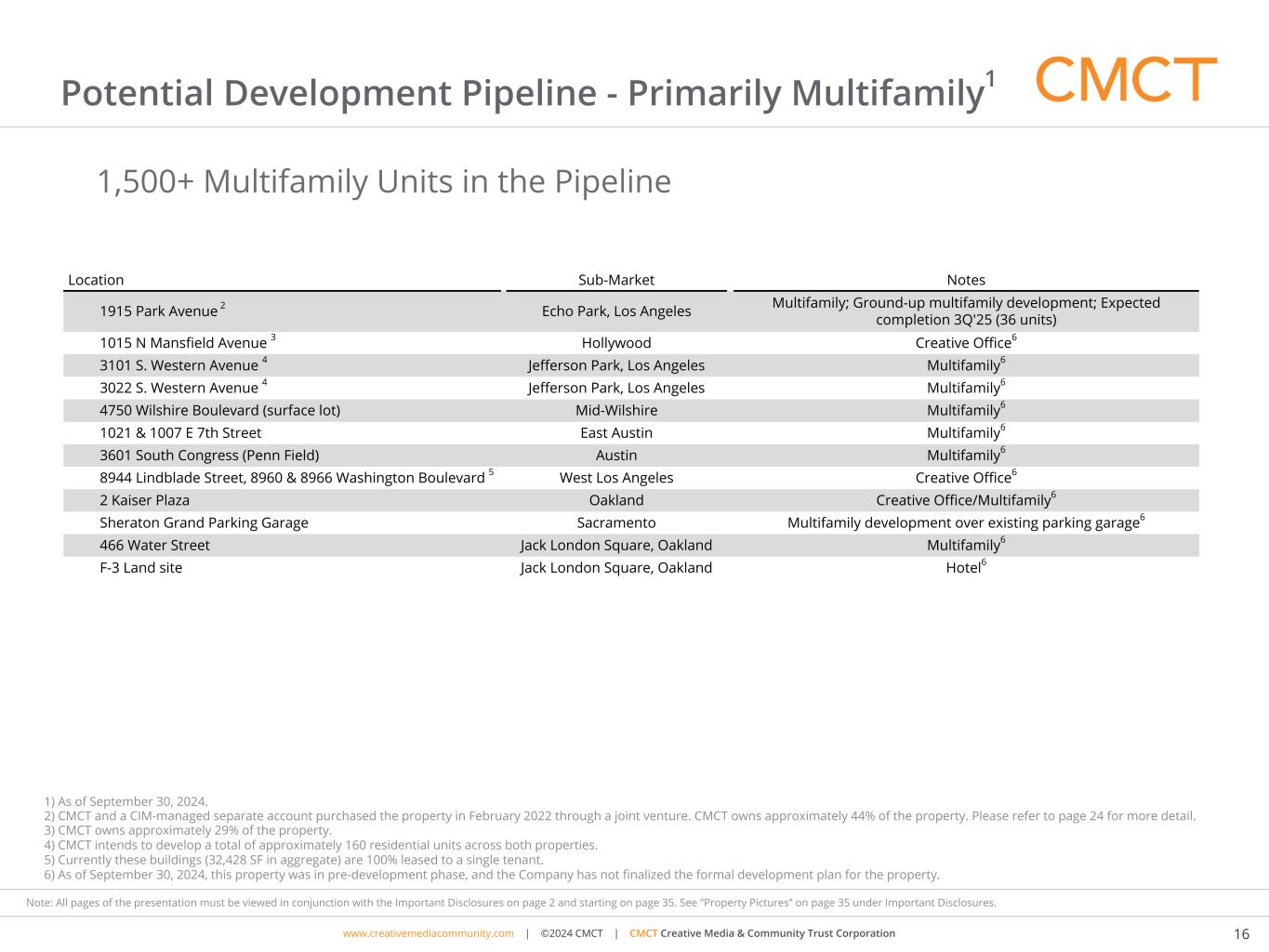 www.cimgroup.com | ©2018 CIM Group | TRADE SECRET / CONFIDENTIAL INFORMATIONwww.creativemediacommunity.com | ©2024 CMCT | CMCT Creative Media & Community Trust Corporation 15 Note: All pages of the presentation must be viewed in conjunction with the Important Disclosures on page 2 and starting on page 35. See “Property Pictures” on page 35 under Important Disclosures. 1) Represents gross monthly base rent under leases commenced as of September 30, 2024, multiplied by twelve. This amount reflects total cash rent before concessions. 2) Represents gross monthly base rent under leases commenced as of September 30, 2024, divided by occupied units. This amount reflects total cash rent before concessions. Net of rent concessions granted in the specified period, monthly rent per occupied unit was $2,444. 3) 701 S Hudson represents the multifamily portion of the property located at 4750 Wilshire Boulevard. 4) Excluding the impact of 701 S Hudson, total multifamily portfolio occupancy was 92.0%, and total multifamily portfolio monthly rent per occupied unit was $2,555. 5) Represents trailing nine-month occupancy as of September 30, 2024, calculated as the number of occupied rooms divided by the number of available rooms. Premier Multifamily and Hotel Multifamily Portfiolio Classification / Market / Property Sub-Market Units % Occupied Annualized Rent (in thousands)1 Monthly Rent Per Occupied Unit2 Consolidated Office Portfolio Oakland, CA Channel House Jack London Distict 333 92.5 % $ 10,152 $ 2,747 1150 Clay Downtown 288 90.6 % 7,882 2,516 Total Consolidated Multifamily Portfolio 621 91.6 % $ 18,034 $ 2,641 Unconsolidated Multifamily Portfolio Los Angeles, CA 1902 Park Avenue - 50% Echo Park 75 94.7 % $ 1,586 $ 1,806 701 S Hudson3 - 20% Mid-Wilshire 68 1.5 % 106 8,861 Total Unconsolidated Multifamily Portfolio 143 50.3 % $ 1,692 $ 1,958 Total Multifamily Portfolio4 764 83.9 % $ 19,726 $ 2,564 Hotel & Parking Garage Location / Property Sub-Market % Occupied5 RevPAR Sacramento, CA Sheraton Grand Hotel Downtown/Midtown 71.4 % $ 145.74 Sheraton Grand Hotel Parking Garage & Retail Downtown/Midtown 68.9 % NA
