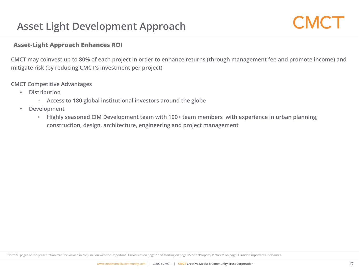 www.cimgroup.com | ©2018 CIM Group | TRADE SECRET / CONFIDENTIAL INFORMATIONwww.creativemediacommunity.com | ©2024 CMCT | CMCT Creative Media & Community Trust Corporation 16 Note: All pages of the presentation must be viewed in conjunction with the Important Disclosures on page 2 and starting on page 35. See “Property Pictures” on page 35 under Important Disclosures. Potential Development Pipeline - Primarily Multifamily1 Location Sub-Market Notes 1915 Park Avenue 2 Echo Park, Los Angeles Multifamily; Ground-up multifamily development; Expected completion 3Q'25 (36 units) 1015 N Mansfield Avenue 3 Hollywood Creative Office6 3101 S. Western Avenue 4 Jefferson Park, Los Angeles Multifamily6 3022 S. Western Avenue 4 Jefferson Park, Los Angeles Multifamily6 4750 Wilshire Boulevard (surface lot) Mid-Wilshire Multifamily6 1021 & 1007 E 7th Street East Austin Multifamily6 3601 South Congress (Penn Field) Austin Multifamily6 8944 Lindblade Street, 8960 & 8966 Washington Boulevard 5 West Los Angeles Creative Office6 2 Kaiser Plaza Oakland Creative Office/Multifamily6 Sheraton Grand Parking Garage Sacramento Multifamily development over existing parking garage6 466 Water Street Jack London Square, Oakland Multifamily6 F-3 Land site Jack London Square, Oakland Hotel6 1) As of September 30, 2024. 2) CMCT and a CIM-managed separate account purchased the property in February 2022 through a joint venture. CMCT owns approximately 44% of the property. Please refer to page 24 for more detail. 3) CMCT owns approximately 29% of the property. 4) CMCT intends to develop a total of approximately 160 residential units across both properties. 5) Currently these buildings (32,428 SF in aggregate) are 100% leased to a single tenant. 6) As of September 30, 2024, this property was in pre-development phase, and the Company has not finalized the formal development plan for the property. 1,500+ Multifamily Units in the Pipeline