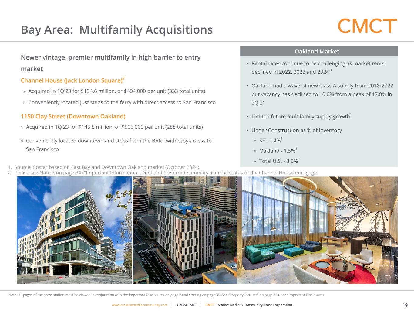 www.cimgroup.com | ©2018 CIM Group | TRADE SECRET / CONFIDENTIAL INFORMATIONwww.creativemediacommunity.com | ©2024 CMCT | CMCT Creative Media & Community Trust Corporation 19 Note: All pages of the presentation must be viewed in conjunction with the Important Disclosures on page 2 and starting on page 35. See “Property Pictures” on page 35 under Important Disclosures. 1. Source: Costar based on East Bay and Downtown Oakland market (October 2024). 2. Please see Note 3 on page 34 ("Important Information - Debt and Preferred Summary") on the status of the Channel House mortgage. Bay Area: Multifamily Acquisitions Channel House (Jack London Square)2 » Acquired in 1Q'23 for $134.6 million, or $404,000 per unit (333 total units) » Conveniently located just steps to the ferry with direct access to San Francisco 1150 Clay Street (Downtown Oakland) » Acquired in 1Q'23 for $145.5 million, or $505,000 per unit (288 total units) » Conveniently located downtown and steps from the BART with easy access to San Francisco Oakland Market Newer vintage, premier multifamily in high barrier to entry market • Rental rates continue to be challenging as market rents declined in 2022, 2023 and 2024 1 • Oakland had a wave of new Class A supply from 2018-2022 but vacancy has declined to 10.0% from a peak of 17.8% in 2Q'21 • Limited future multifamily supply growth1 • Under Construction as % of Inventory ◦ SF - 1.4%1 ◦ Oakland - 1.5%1 ◦ Total U.S. - 3.5%1