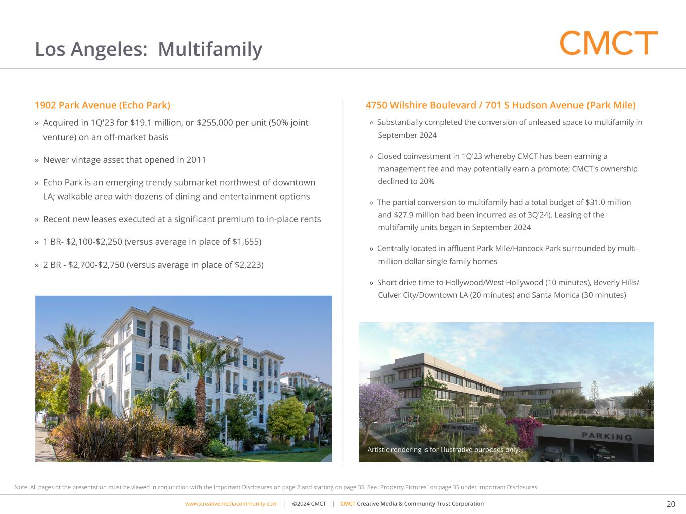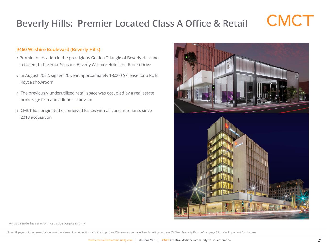 www.cimgroup.com | ©2018 CIM Group | TRADE SECRET / CONFIDENTIAL INFORMATIONwww.creativemediacommunity.com | ©2024 CMCT | CMCT Creative Media & Community Trust Corporation 20 Note: All pages of the presentation must be viewed in conjunction with the Important Disclosures on page 2 and starting on page 35. See “Property Pictures” on page 35 under Important Disclosures. Los Angeles: Multifamily 4750 Wilshire Boulevard / 701 S Hudson Avenue (Park Mile) » Substantially completed the conversion of unleased space to multifamily in September 2024 » Closed coinvestment in 1Q'23 whereby CMCT has been earning a management fee and may potentially earn a promote; CMCT's ownership declined to 20% » The partial conversion to multifamily had a total budget of $31.0 million and $27.9 million had been incurred as of 3Q'24). Leasing of the multifamily units began in September 2024 » Centrally located in affluent Park Mile/Hancock Park surrounded by multi- million dollar single family homes » Short drive time to Hollywood/West Hollywood (10 minutes), Beverly Hills/ Culver City/Downtown LA (20 minutes) and Santa Monica (30 minutes) 1902 Park Avenue (Echo Park) » Acquired in 1Q'23 for $19.1 million, or $255,000 per unit (50% joint venture) on an off-market basis » Newer vintage asset that opened in 2011 » Echo Park is an emerging trendy submarket northwest of downtown LA; walkable area with dozens of dining and entertainment options » Recent new leases executed at a significant premium to in-place rents » 1 BR- $2,100-$2,250 (versus average in place of $1,655) » 2 BR - $2,700-$2,750 (versus average in place of $2,223) Artistic rendering is for illustrative purposes only.