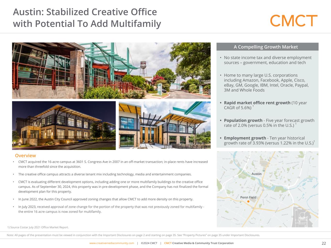 www.cimgroup.com | ©2018 CIM Group | TRADE SECRET / CONFIDENTIAL INFORMATIONwww.creativemediacommunity.com | ©2024 CMCT | CMCT Creative Media & Community Trust Corporation 22 Note: All pages of the presentation must be viewed in conjunction with the Important Disclosures on page 2 and starting on page 35. See “Property Pictures” on page 35 under Important Disclosures. Austin: Stabilized Creative Office with Potential To Add Multifamily • CMCT acquired the 16-acre campus at 3601 S. Congress Ave in 2007 in an off-market transaction; in-place rents have increased more than threefold since the acquisition. • The creative office campus attracts a diverse tenant mix including technology, media and entertainment companies. • CMCT is evaluating different development options, including adding one or more multifamily buildings to the creative office campus. As of September 30, 2024, this property was in pre-development phase, and the Company has not finalized the formal development plan for this property. • In June 2022, the Austin City Council approved zoning changes that allow CMCT to add more density on this property. • In July 2023, received approval of zone change for the portion of the property that was not previously zoned for multifamily - the entire 16 acre campus is now zoned for multifamily. • No state income tax and diverse employment sources – government, education and tech • Home to many large U.S. corporations including Amazon, Facebook, Apple, Cisco, eBay, GM, Google, IBM, Intel, Oracle, Paypal, 3M and Whole Foods • Rapid market office rent growth (10 year CAGR of 5.6%) 1 • Population growth - Five year forecast growth rate of 2.0% (versus 0.5% in the U.S.) 1 • Employment growth - Ten year historical growth rate of 3.93% (versus 1.22% in the U.S.)1 A Compelling Growth Market Austin Overview Penn Field Penn Field Austin 1) Source Costar July 2021 Office Market Report.