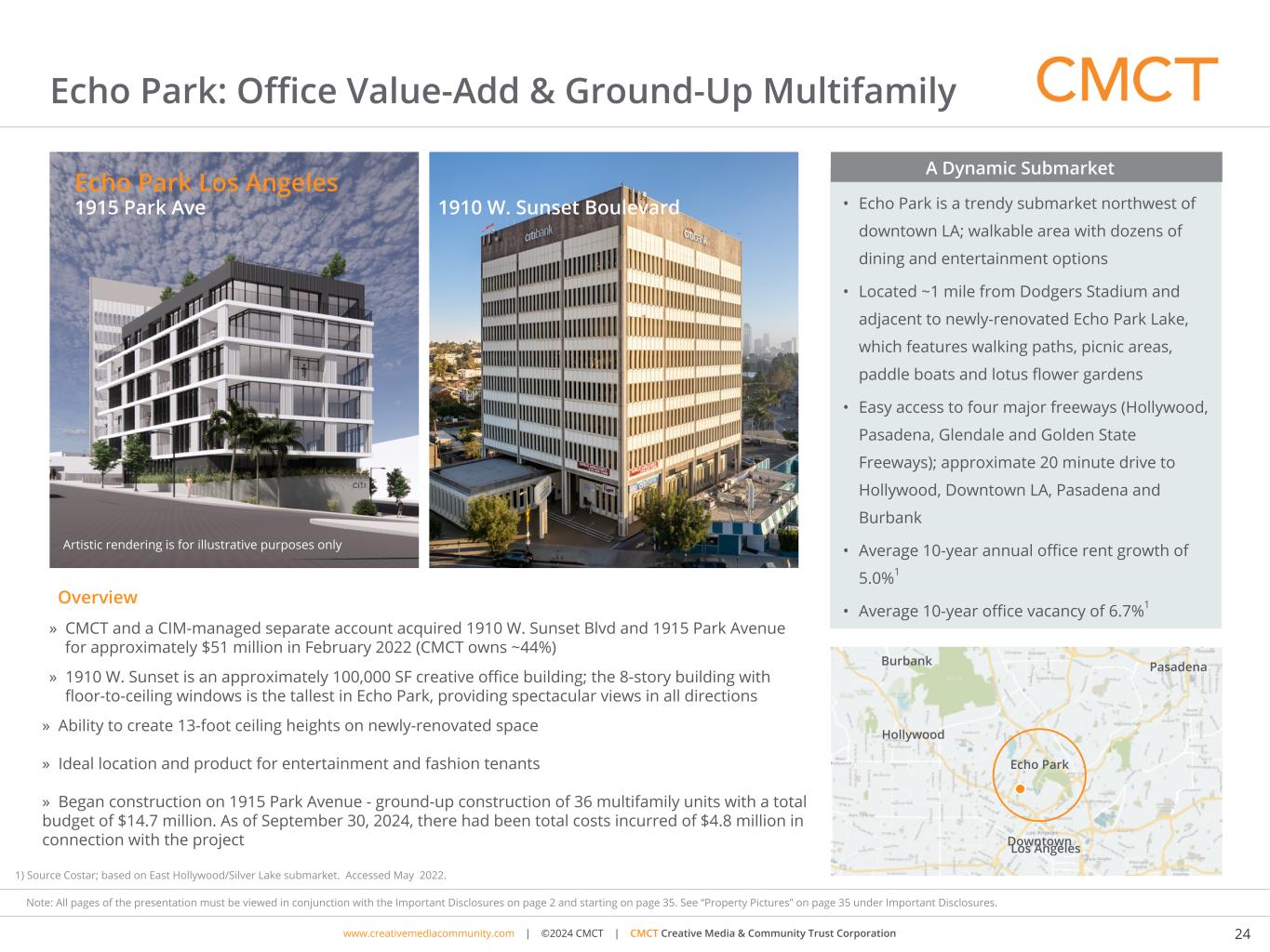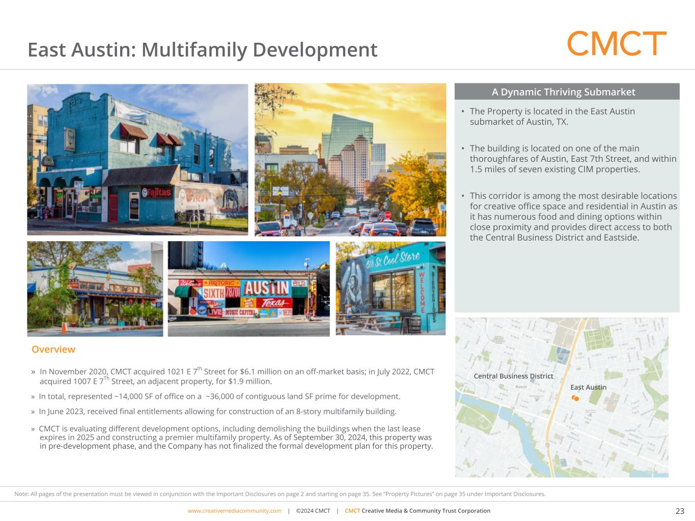 www.cimgroup.com | ©2018 CIM Group | TRADE SECRET / CONFIDENTIAL INFORMATIONwww.creativemediacommunity.com | ©2024 CMCT | CMCT Creative Media & Community Trust Corporation 23 Note: All pages of the presentation must be viewed in conjunction with the Important Disclosures on page 2 and starting on page 35. See “Property Pictures” on page 35 under Important Disclosures. East Austin: Multifamily Development • The Property is located in the East Austin submarket of Austin, TX. • The building is located on one of the main thoroughfares of Austin, East 7th Street, and within 1.5 miles of seven existing CIM properties. • This corridor is among the most desirable locations for creative office space and residential in Austin as it has numerous food and dining options within close proximity and provides direct access to both the Central Business District and Eastside. A Dynamic Thriving Submarket Overview Central Business District East Austin East Austin, Texas » In November 2020, CMCT acquired 1021 E 7th Street for $6.1 million on an off-market basis; in July 2022, CMCT acquired 1007 E 7Th Street, an adjacent property, for $1.9 million. » In total, represented ~14,000 SF of office on a ~36,000 of contiguous land SF prime for development. » In June 2023, received final entitlements allowing for construction of an 8-story multifamily building. » CMCT is evaluating different development options, including demolishing the buildings when the last lease expires in 2025 and constructing a premier multifamily property. As of September 30, 2024, this property was in pre-development phase, and the Company has not finalized the formal development plan for this property.