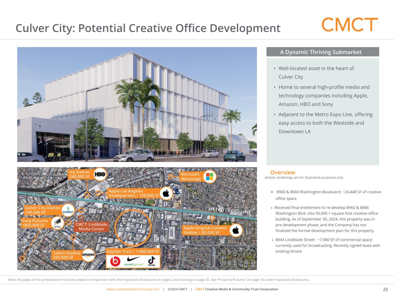 www.cimgroup.com | ©2018 CIM Group | TRADE SECRET / CONFIDENTIAL INFORMATIONwww.creativemediacommunity.com | ©2024 CMCT | CMCT Creative Media & Community Trust Corporation 24 Note: All pages of the presentation must be viewed in conjunction with the Important Disclosures on page 2 and starting on page 35. See “Property Pictures” on page 35 under Important Disclosures. Echo Park: Office Value-Add & Ground-Up Multifamily » CMCT and a CIM-managed separate account acquired 1910 W. Sunset Blvd and 1915 Park Avenue for approximately $51 million in February 2022 (CMCT owns ~44%) » 1910 W. Sunset is an approximately 100,000 SF creative office building; the 8-story building with floor-to-ceiling windows is the tallest in Echo Park, providing spectacular views in all directions » Ability to create 13-foot ceiling heights on newly-renovated space » Ideal location and product for entertainment and fashion tenants » Began construction on 1915 Park Avenue - ground-up construction of 36 multifamily units with a total budget of $14.7 million. As of September 30, 2024, there had been total costs incurred of $4.8 million in connection with the project • Echo Park is a trendy submarket northwest of downtown LA; walkable area with dozens of dining and entertainment options • Located ~1 mile from Dodgers Stadium and adjacent to newly-renovated Echo Park Lake, which features walking paths, picnic areas, paddle boats and lotus flower gardens • Easy access to four major freeways (Hollywood, Pasadena, Glendale and Golden State Freeways); approximate 20 minute drive to Hollywood, Downtown LA, Pasadena and Burbank • Average 10-year annual office rent growth of 5.0%1 • Average 10-year office vacancy of 6.7%1 A Dynamic Submarket Echo Park Los Angeles 1915 Park Ave 1910 W. Sunset Boulevard Overview Echo Park Downtown Los Angeles Hollywood PasadenaBurbank 1) Source Costar; based on East Hollywood/Silver Lake submarket. Accessed May 2022. Artistic rendering is for illustrative purposes only