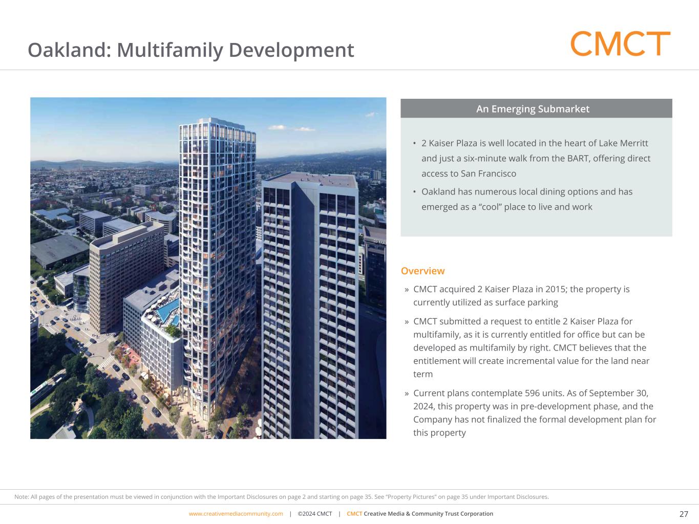 www.cimgroup.com | ©2018 CIM Group | TRADE SECRET / CONFIDENTIAL INFORMATIONwww.creativemediacommunity.com | ©2024 CMCT | CMCT Creative Media & Community Trust Corporation 26 Note: All pages of the presentation must be viewed in conjunction with the Important Disclosures on page 2 and starting on page 35. See “Property Pictures” on page 35 under Important Disclosures. Jefferson Park: Multifamily Development » In 1Q'22, CMCT acquired 3101 S. Western, which is located on a ~11,300 SF land site for $2.3 million » CMCT is considering developing approximately 40 residential units. As of September 30, 2024, this property was in pre-development phase, and the Company has not finalized the formal development plan for this property » In 2Q'22, CMCT acquired 3022 S. Western, which is located on a ~28,300 SF land site for $5.6 million » CMCT is considering developing 119 residential units. As of September 30, 2024, this property was in pre-development phase, and the Company has not finalized the formal development plan for this property Culver City Los Angeles Overview • Jefferson Park is home to a variety of residential buildings, shops, restaurants and offices • Adjacent to West Adams neighborhood where CIM has renovated and developed dozens of apartments, restaurants and retail spaces since 2016 • Convenient access to the 10 and 110 freeways • 1.5 miles from the University of Southern California and 5.5 miles from downtown Culver City, home to several premier technology and entertainment companies An Emerging Submarket Artistic renderings are for illustrative purposes only
