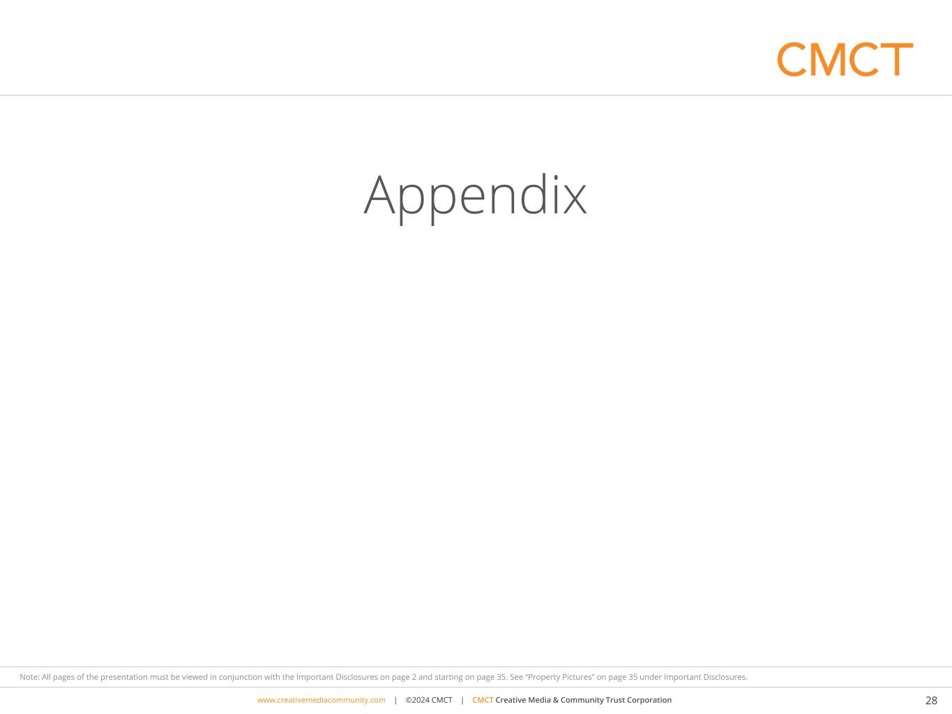 www.cimgroup.com | ©2018 CIM Group | TRADE SECRET / CONFIDENTIAL INFORMATIONwww.creativemediacommunity.com | ©2024 CMCT | CMCT Creative Media & Community Trust Corporation 28 Note: All pages of the presentation must be viewed in conjunction with the Important Disclosures on page 2 and starting on page 35. See “Property Pictures” on page 35 under Important Disclosures. Appendix