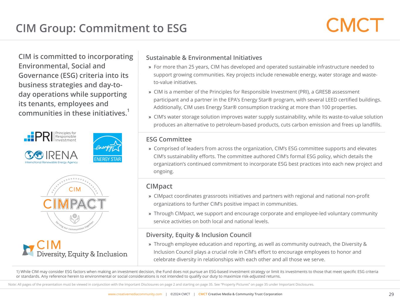 www.cimgroup.com | ©2018 CIM Group | TRADE SECRET / CONFIDENTIAL INFORMATIONwww.creativemediacommunity.com | ©2024 CMCT | CMCT Creative Media & Community Trust Corporation 29 Note: All pages of the presentation must be viewed in conjunction with the Important Disclosures on page 2 and starting on page 35. See “Property Pictures” on page 35 under Important Disclosures. CIM Group: Commitment to ESG CIM is committed to incorporating Environmental, Social and Governance (ESG) criteria into its business strategies and day-to- day operations while supporting its tenants, employees and communities in these initiatives.1 Sustainable & Environmental Initiatives » For more than 25 years, CIM has developed and operated sustainable infrastructure needed to support growing communities. Key projects include renewable energy, water storage and waste- to-value initiatives. » CIM is a member of the Principles for Responsible Investment (PRI), a GRESB assessment participant and a partner in the EPA’s Energy Star® program, with several LEED certified buildings. Additionally, CIM uses Energy Star® consumption tracking at more than 100 properties. » CIM’s water storage solution improves water supply sustainability, while its waste-to-value solution produces an alternative to petroleum-based products, cuts carbon emission and frees up landfills. ESG Committee » Comprised of leaders from across the organization, CIM’s ESG committee supports and elevates CIM’s sustainability efforts. The committee authored CIM’s formal ESG policy, which details the organization’s continued commitment to incorporate ESG best practices into each new project and ongoing. CIMpact » CIMpact coordinates grassroots initiatives and partners with regional and national non-profit organizations to further CIM’s positive impact in communities. » Through CIMpact, we support and encourage corporate and employee-led voluntary community service activities on both local and national levels. Diversity, Equity & Inclusion Council » Through employee education and reporting, as well as community outreach, the Diversity & Inclusion Council plays a crucial role in CIM’s effort to encourage employees to honor and celebrate diversity in relationships with each other and all those we serve. 1) While CIM may consider ESG factors when making an investment decision, the Fund does not pursue an ESG-based investment strategy or limit its investments to those that meet specific ESG criteria or standards. Any reference herein to environmental or social considerations is not intended to qualify our duty to maximize risk-adjusted returns.