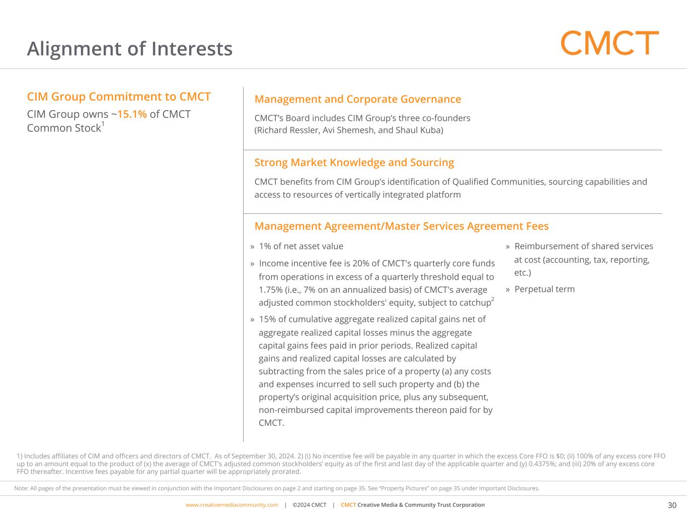 www.cimgroup.com | ©2018 CIM Group | TRADE SECRET / CONFIDENTIAL INFORMATIONwww.creativemediacommunity.com | ©2024 CMCT | CMCT Creative Media & Community Trust Corporation 30 Note: All pages of the presentation must be viewed in conjunction with the Important Disclosures on page 2 and starting on page 35. See “Property Pictures” on page 35 under Important Disclosures. Alignment of Interests CIM Group Commitment to CMCT CIM Group owns ~15.1% of CMCT Common Stock1 1) Includes affiliates of CIM and officers and directors of CMCT. As of September 30, 2024. 2) (i) No incentive fee will be payable in any quarter in which the excess Core FFO is $0; (ii) 100% of any excess core FFO up to an amount equal to the product of (x) the average of CMCT's adjusted common stockholders’ equity as of the first and last day of the applicable quarter and (y) 0.4375%; and (iii) 20% of any excess core FFO thereafter. Incentive fees payable for any partial quarter will be appropriately prorated. Management and Corporate Governance CMCT’s Board includes CIM Group’s three co-founders (Richard Ressler, Avi Shemesh, and Shaul Kuba) Strong Market Knowledge and Sourcing CMCT benefits from CIM Group’s identification of Qualified Communities, sourcing capabilities and access to resources of vertically integrated platform Management Agreement/Master Services Agreement Fees » 1% of net asset value » Income incentive fee is 20% of CMCT's quarterly core funds from operations in excess of a quarterly threshold equal to 1.75% (i.e., 7% on an annualized basis) of CMCT's average adjusted common stockholders' equity, subject to catchup2 » 15% of cumulative aggregate realized capital gains net of aggregate realized capital losses minus the aggregate capital gains fees paid in prior periods. Realized capital gains and realized capital losses are calculated by subtracting from the sales price of a property (a) any costs and expenses incurred to sell such property and (b) the property’s original acquisition price, plus any subsequent, non-reimbursed capital improvements thereon paid for by CMCT. » Reimbursement of shared services at cost (accounting, tax, reporting, etc.) » Perpetual term