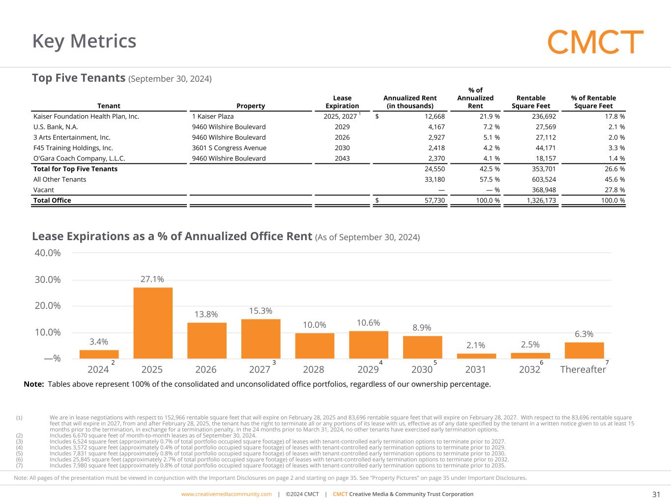 www.cimgroup.com | ©2018 CIM Group | TRADE SECRET / CONFIDENTIAL INFORMATIONwww.creativemediacommunity.com | ©2024 CMCT | CMCT Creative Media & Community Trust Corporation 31 Note: All pages of the presentation must be viewed in conjunction with the Important Disclosures on page 2 and starting on page 35. See “Property Pictures” on page 35 under Important Disclosures. Key Metrics Lease Expirations as a % of Annualized Office Rent (As of September 30, 2024) Top Five Tenants (September 30, 2024) (1) We are in lease negotiations with respect to 152,966 rentable square feet that will expire on February 28, 2025 and 83,696 rentable square feet that will expire on February 28, 2027. With respect to the 83,696 rentable square feet that will expire in 2027, from and after February 28, 2025, the tenant has the right to terminate all or any portions of its lease with us, effective as of any date specified by the tenant in a written notice given to us at least 15 months prior to the termination, in exchange for a termination penalty. In the 24 months prior to March 31, 2024, no other tenants have exercised early termination options. (2) Includes 6,670 square feet of month-to-month leases as of September 30, 2024. (3) Includes 6,524 square feet (approximately 0.7% of total portfolio occupied square footage) of leases with tenant-controlled early termination options to terminate prior to 2027. (4) Includes 3,572 square feet (approximately 0.4% of total portfolio occupied square footage) of leases with tenant-controlled early termination options to terminate prior to 2029. (5) Includes 7,831 square feet (approximately 0.8% of total portfolio occupied square footage) of leases with tenant-controlled early termination options to terminate prior to 2030. (6) Includes 25,845 square feet (approximately 2.7% of total portfolio occupied square footage) of leases with tenant-controlled early termination options to terminate prior to 2032. (7) Includes 7,980 square feet (approximately 0.8% of total portfolio occupied square footage) of leases with tenant-controlled early termination options to terminate prior to 2035. 3.4% 27.1% 13.8% 15.3% 10.0% 10.6% 8.9% 2.1% 2.5% 6.3% 2024 2025 2026 2027 2028 2029 2030 2031 2032 Thereafter —% 10.0% 20.0% 30.0% 40.0% Tenant Property Lease Expiration Annualized Rent (in thousands) % of Annualized Rent Rentable Square Feet % of Rentable Square Feet Kaiser Foundation Health Plan, Inc. 1 Kaiser Plaza 2025, 2027 1 $ 12,668 21.9 % 236,692 17.8 % U.S. Bank, N.A. 9460 Wilshire Boulevard 2029 4,167 7.2 % 27,569 2.1 % 3 Arts Entertainment, Inc. 9460 Wilshire Boulevard 2026 2,927 5.1 % 27,112 2.0 % F45 Training Holdings, Inc. 3601 S Congress Avenue 2030 2,418 4.2 % 44,171 3.3 % O'Gara Coach Company, L.L.C. 9460 Wilshire Boulevard 2043 2,370 4.1 % 18,157 1.4 % Total for Top Five Tenants 24,550 42.5 % 353,701 26.6 % All Other Tenants 33,180 57.5 % 603,524 45.6 % Vacant — — % 368,948 27.8 % Total Office $ 57,730 100.0 % 1,326,173 100.0 % 2 Note: Tables above represent 100% of the consolidated and unconsolidated office portfolios, regardless of our ownership percentage. 3 4 65 7