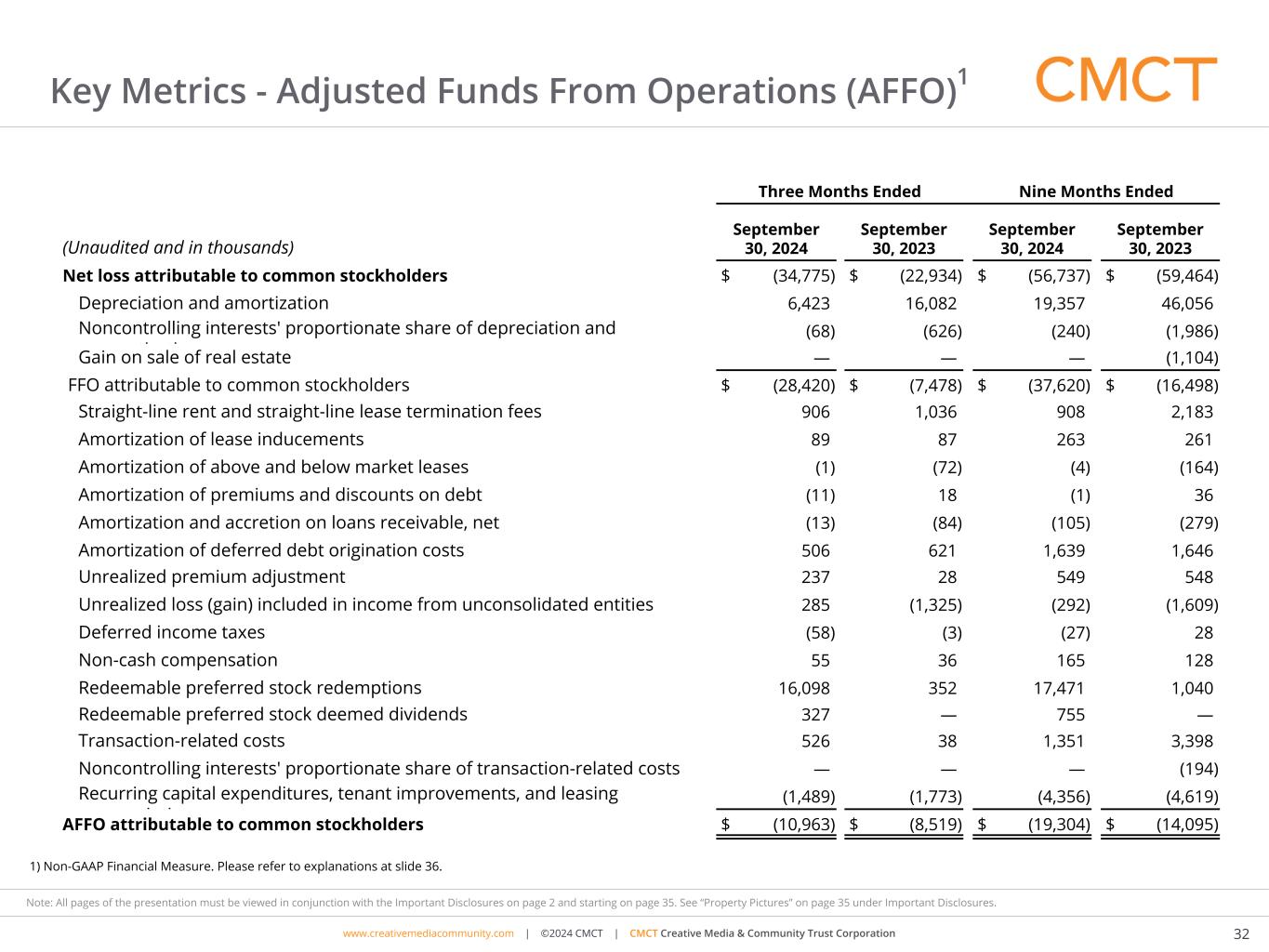www.cimgroup.com | ©2018 CIM Group | TRADE SECRET / CONFIDENTIAL INFORMATIONwww.creativemediacommunity.com | ©2024 CMCT | CMCT Creative Media & Community Trust Corporation 32 Note: All pages of the presentation must be viewed in conjunction with the Important Disclosures on page 2 and starting on page 35. See “Property Pictures” on page 35 under Important Disclosures. Key Metrics - Adjusted Funds From Operations (AFFO)1 1) Non-GAAP Financial Measure. Please refer to explanations at slide 36. Three Months Ended Nine Months Ended (Unaudited and in thousands) September 30, 2024 September 30, 2023 September 30, 2024 September 30, 2023 Net loss attributable to common stockholders $ (34,775) $ (22,934) $ (56,737) $ (59,464) Depreciation and amortization 6,423 16,082 19,357 46,056 Noncontrolling interests' proportionate share of depreciation and amortization (68) (626) (240) (1,986) Gain on sale of real estate — — — (1,104) FFO attributable to common stockholders $ (28,420) $ (7,478) $ (37,620) $ (16,498) Straight-line rent and straight-line lease termination fees 906 1,036 908 2,183 Amortization of lease inducements 89 87 263 261 Amortization of above and below market leases (1) (72) (4) (164) Amortization of premiums and discounts on debt (11) 18 (1) 36 Amortization and accretion on loans receivable, net (13) (84) (105) (279) Amortization of deferred debt origination costs 506 621 1,639 1,646 Unrealized premium adjustment 237 28 549 548 Unrealized loss (gain) included in income from unconsolidated entities 285 (1,325) (292) (1,609) Deferred income taxes (58) (3) (27) 28 Non-cash compensation 55 36 165 128 Redeemable preferred stock redemptions 16,098 352 17,471 1,040 Redeemable preferred stock deemed dividends 327 — 755 — Transaction-related costs 526 38 1,351 3,398 Noncontrolling interests' proportionate share of transaction-related costs — — — (194) Recurring capital expenditures, tenant improvements, and leasing commissions (1,489) (1,773) (4,356) (4,619) AFFO attributable to common stockholders $ (10,963) $ (8,519) $ (19,304) $ (14,095)