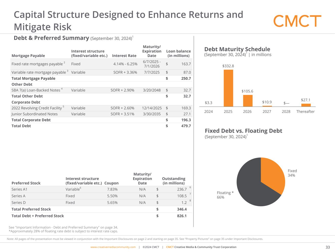 www.cimgroup.com | ©2018 CIM Group | TRADE SECRET / CONFIDENTIAL INFORMATIONwww.creativemediacommunity.com | ©2024 CMCT | CMCT Creative Media & Community Trust Corporation 33 Note: All pages of the presentation must be viewed in conjunction with the Important Disclosures on page 2 and starting on page 35. See “Property Pictures” on page 35 under Important Disclosures. $3.3 $332.8 $105.6 $10.9 $— $27.1 2024 2025 2026 2027 2028 Thereafter Debt & Preferred Summary (September 30, 2024)1 Fixed 34% Floating * 66% Debt Maturity Schedule (September 30, 2024)1 | in millions Fixed Debt vs. Floating Debt (September 30, 2024)1 Mortgage Payable Interest structure (fixed/variable etc.) Interest Rate Maturity/ Expiration Date Loan balance (in millions) Fixed rate mortgages payable 2 Fixed 4.14% - 6.25% 6/7/2025 - 7/1/2026 $ 163.7 Variable rate mortgage payable 3 Variable SOFR + 3.36% 7/7/2025 $ 87.0 Total Mortgage Payable $ 250.7 Other Debt SBA 7(a) Loan-Backed Notes 4 Variable SOFR + 2.90% 3/20/2048 $ 32.7 Total Other Debt $ 32.7 Corporate Debt 2022 Revolving Credit Facility 5 Variable SOFR + 2.60% 12/14/2025 $ 169.3 Junior Subordinated Notes Variable SOFR + 3.51% 3/30/2035 $ 27.1 Total Corporate Debt $ 196.3 Total Debt $ 479.7 Preferred Stock Interest structure (fixed/variable etc.) Coupon Maturity/ Expiration Date Outstanding (in millions) Series A1 Variable6 7.83% N/A $ 236.7 6 Series A Fixed 5.50% N/A $ 108.5 7 Series D Fixed 5.65% N/A $ 1.2 8 Total Preferred Stock $ 346.4 Total Debt + Preferred Stock $ 826.1 Capital Structure Designed to Enhance Returns and Mitigate Risk See "Important Information - Debt and Preferred Summary" on page 34. *Approximately 28% of floating rate debt is subject to interest rate caps.