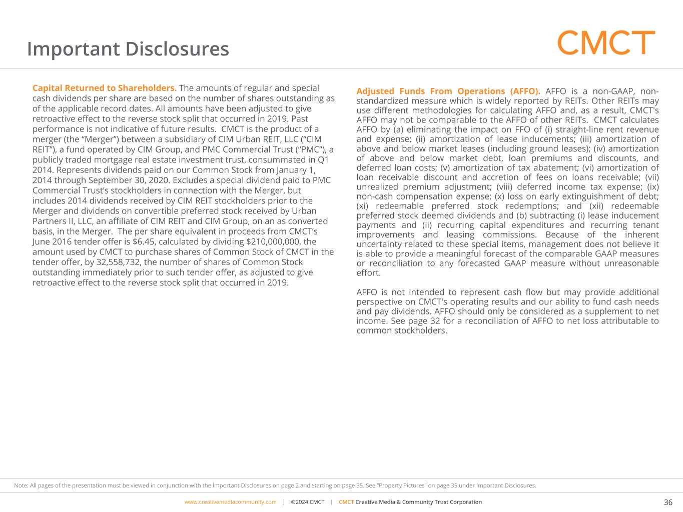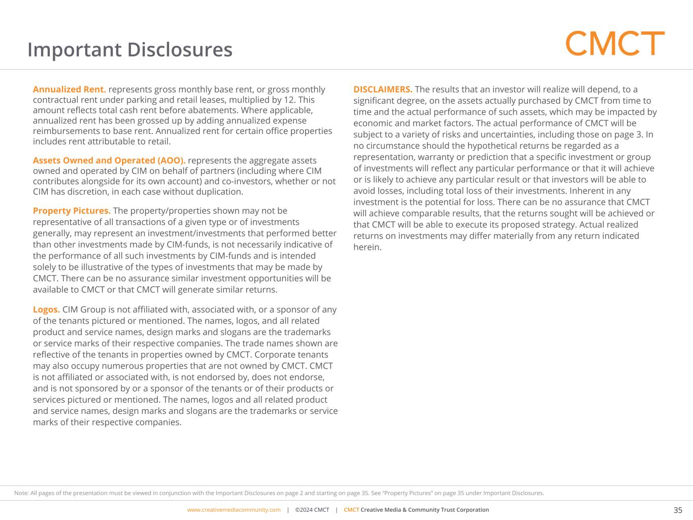 www.cimgroup.com | ©2018 CIM Group | TRADE SECRET / CONFIDENTIAL INFORMATIONwww.creativemediacommunity.com | ©2024 CMCT | CMCT Creative Media & Community Trust Corporation 35 Note: All pages of the presentation must be viewed in conjunction with the Important Disclosures on page 2 and starting on page 35. See “Property Pictures” on page 35 under Important Disclosures. Important Disclosures Annualized Rent. represents gross monthly base rent, or gross monthly contractual rent under parking and retail leases, multiplied by 12. This amount reflects total cash rent before abatements. Where applicable, annualized rent has been grossed up by adding annualized expense reimbursements to base rent. Annualized rent for certain office properties includes rent attributable to retail. Assets Owned and Operated (AOO). represents the aggregate assets owned and operated by CIM on behalf of partners (including where CIM contributes alongside for its own account) and co-investors, whether or not CIM has discretion, in each case without duplication. Property Pictures. The property/properties shown may not be representative of all transactions of a given type or of investments generally, may represent an investment/investments that performed better than other investments made by CIM-funds, is not necessarily indicative of the performance of all such investments by CIM-funds and is intended solely to be illustrative of the types of investments that may be made by CMCT. There can be no assurance similar investment opportunities will be available to CMCT or that CMCT will generate similar returns. Logos. CIM Group is not affiliated with, associated with, or a sponsor of any of the tenants pictured or mentioned. The names, logos, and all related product and service names, design marks and slogans are the trademarks or service marks of their respective companies. The trade names shown are reflective of the tenants in properties owned by CMCT. Corporate tenants may also occupy numerous properties that are not owned by CMCT. CMCT is not affiliated or associated with, is not endorsed by, does not endorse, and is not sponsored by or a sponsor of the tenants or of their products or services pictured or mentioned. The names, logos and all related product and service names, design marks and slogans are the trademarks or service marks of their respective companies. DISCLAIMERS. The results that an investor will realize will depend, to a significant degree, on the assets actually purchased by CMCT from time to time and the actual performance of such assets, which may be impacted by economic and market factors. The actual performance of CMCT will be subject to a variety of risks and uncertainties, including those on page 3. In no circumstance should the hypothetical returns be regarded as a representation, warranty or prediction that a specific investment or group of investments will reflect any particular performance or that it will achieve or is likely to achieve any particular result or that investors will be able to avoid losses, including total loss of their investments. Inherent in any investment is the potential for loss. There can be no assurance that CMCT will achieve comparable results, that the returns sought will be achieved or that CMCT will be able to execute its proposed strategy. Actual realized returns on investments may differ materially from any return indicated herein.