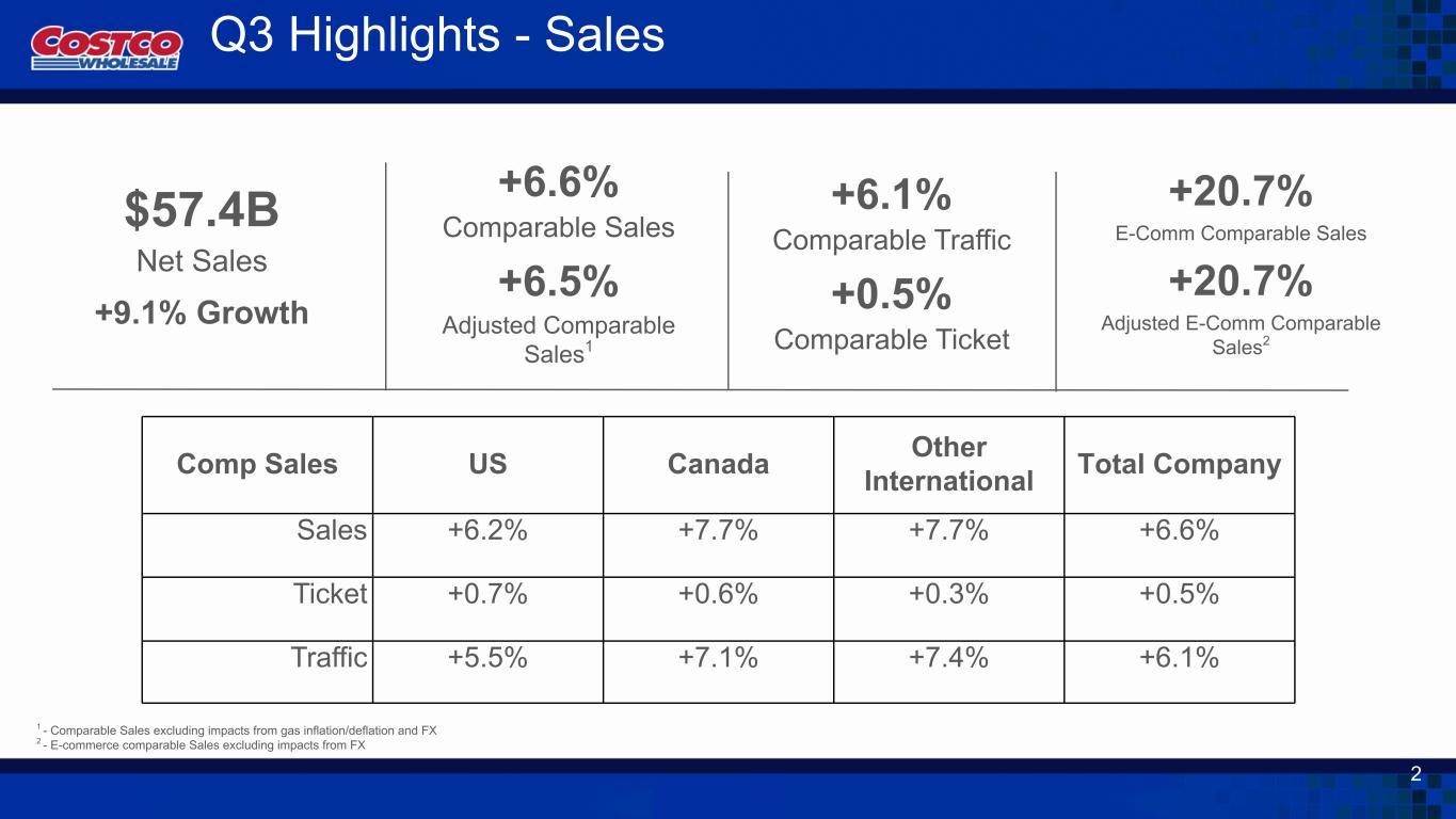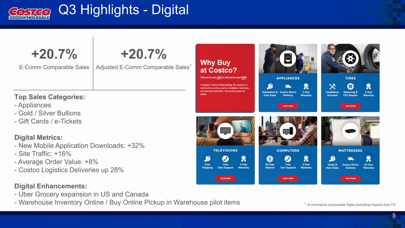+20.7% E-Comm Comparable Sales 1 - E-commerce comparable Sales excluding impacts from FX +20.7% Adjusted E-Comm Comparable Sales1 Top Sales Categories: - Appliances - Gold / Silver Bullions - Gift Cards / e-Tickets Digital Metrics: - New Mobile Application Downloads: +32% - Site Traffic: +16% - Average Order Value: +8% - Costco Logistics Deliveries up 28% Digital Enhancements: - Uber Grocery expansion in US and Canada - Warehouse Inventory Online / Buy Online Pickup in Warehouse pilot items Q3 Highlights - Digital 5