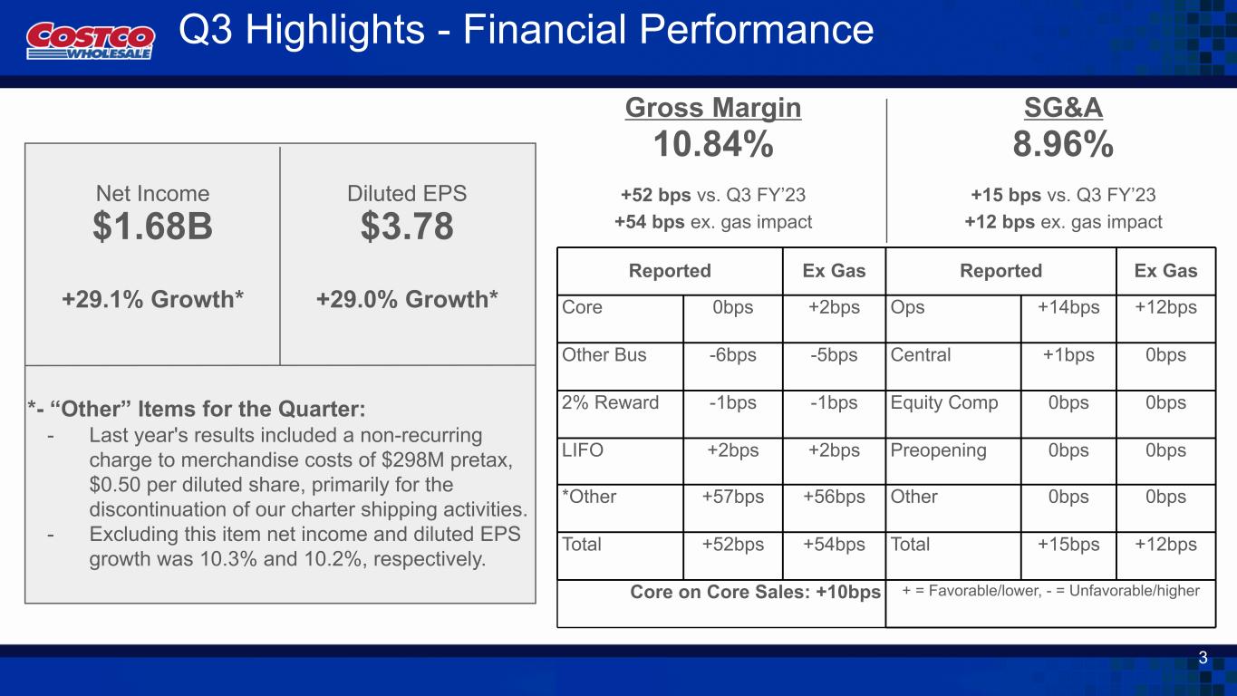 Q3 Highlights - Financial Performance Reported Ex Gas Reported Ex Gas Core 0bps +2bps Ops +14bps +12bps Other Bus -6bps -5bps Central +1bps 0bps 2% Reward -1bps -1bps Equity Comp 0bps 0bps LIFO +2bps +2bps Preopening 0bps 0bps *Other +57bps +56bps Other 0bps 0bps Total +52bps +54bps Total +15bps +12bps Core on Core Sales: +10bps + = Favorable/lower, - = Unfavorable/higher Gross Margin 10.84% +52 bps vs. Q3 FY’23 +54 bps ex. gas impact SG&A 8.96% +15 bps vs. Q3 FY’23 +12 bps ex. gas impact Diluted EPS $3.78 +29.0% Growth* Net Income $1.68B +29.1% Growth* *- “Other” Items for the Quarter: - Last year's results included a non-recurring charge to merchandise costs of $298M pretax, $0.50 per diluted share, primarily for the discontinuation of our charter shipping activities. - Excluding this item net income and diluted EPS growth was 10.3% and 10.2%, respectively. 3