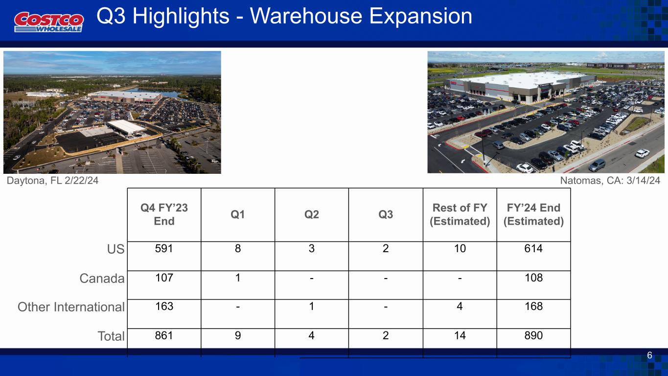 Q4 FY’23 End Q1 Q2 Q3 Rest of FY (Estimated) FY’24 End (Estimated) US 591 8 3 2 10 614 Canada 107 1 - - - 108 Other International 163 - 1 - 4 168 Total 861 9 4 2 14 890 Q3 Highlights - Warehouse Expansion Daytona, FL 2/22/24 Natomas, CA: 3/14/24 6