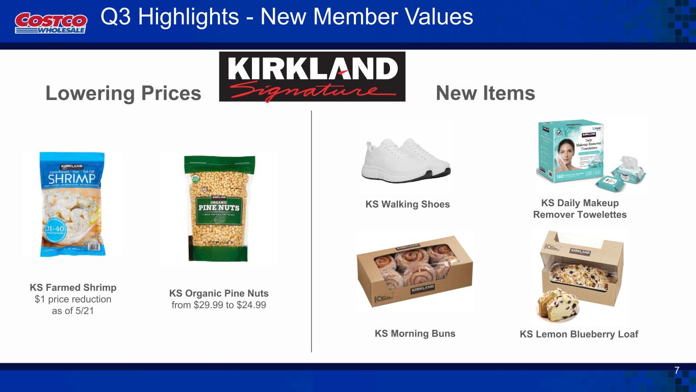 Q3 Highlights - New Member Values KS Lemon Blueberry Loaf KS Daily Makeup Remover Towelettes 7 Lowering Prices New Items KS Farmed Shrimp $1 price reduction as of 5/21 KS Organic Pine Nuts from $29.99 to $24.99 KS Morning Buns KS Walking Shoes