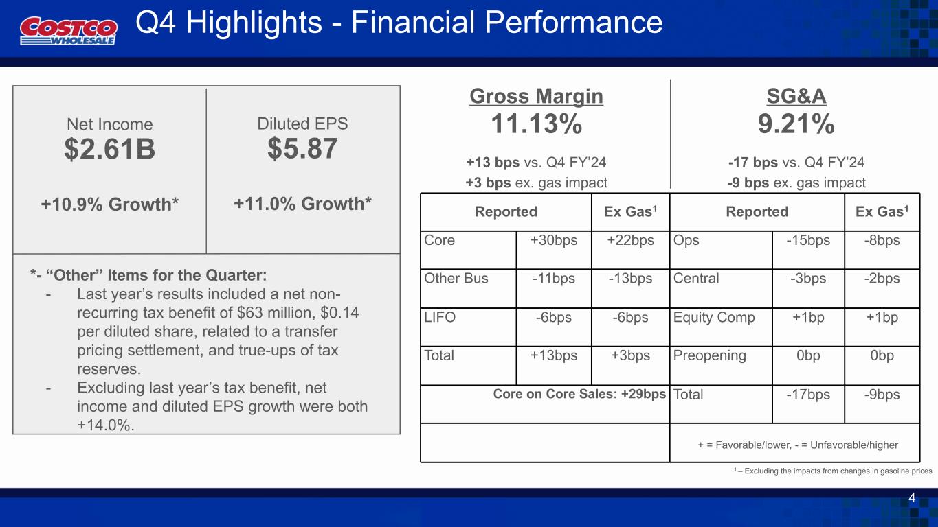 Q4 Highlights – Sales - Segment Reporting 1 - Excluding impacts from changes in gasoline prices and foreign exchange Comp Sales US Canada Other International Total Company Sales +5.1% +6.3% +8.6% +5.7% Ticket +1.5% +1.0% +5.2% +1.9% Traffic +3.5% +5.3% +3.2% +3.7% 3 Adjusted Comp Sales1 US Canada Other International Total Company Sales +6.0% +8.3% +7.2% +6.4% Ticket +2.4% +2.8% +3.9% +2.6% Traffic +3.5% +5.3% +3.2% +3.7%