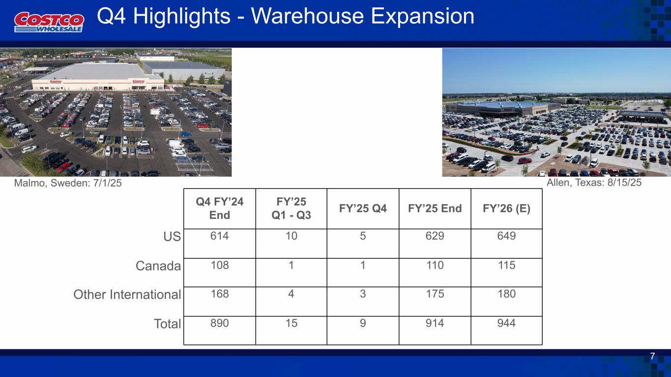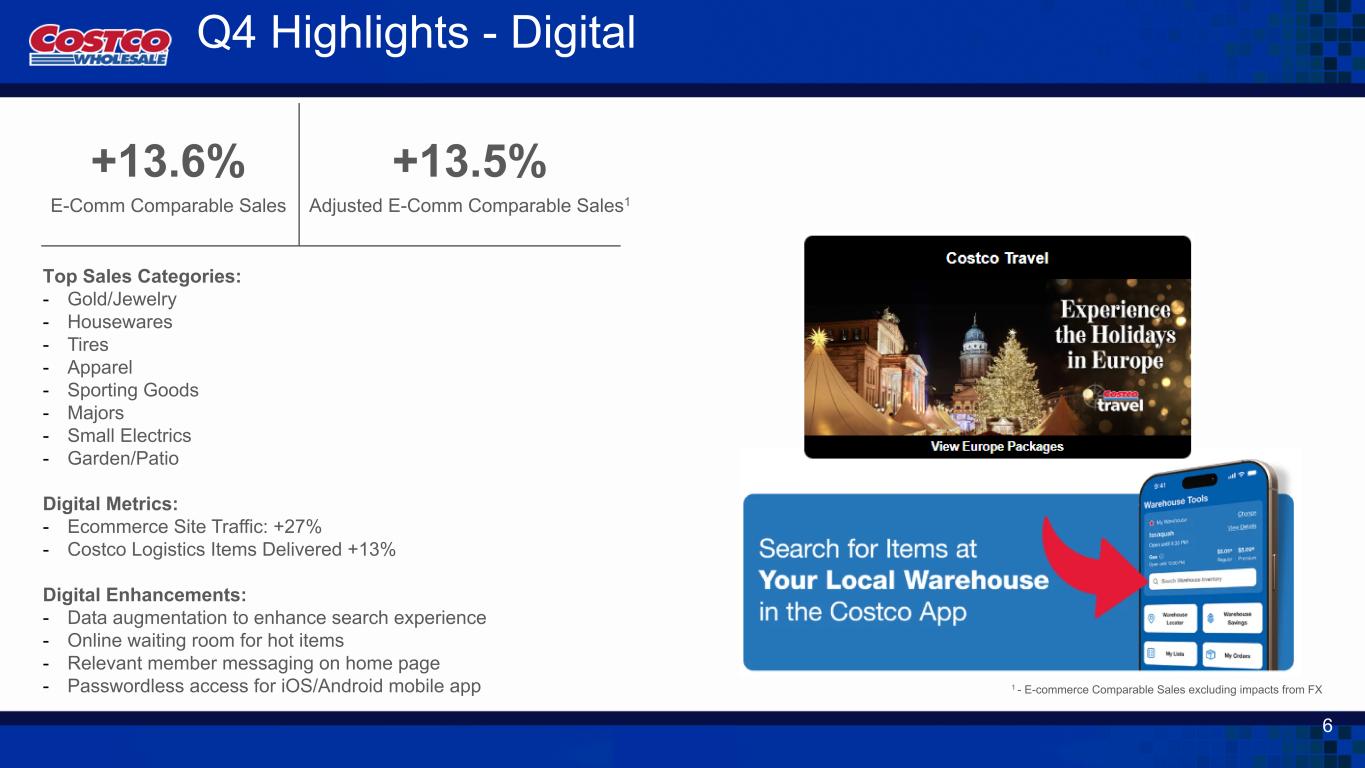 +13.6% E-Comm Comparable Sales 1 - E-commerce Comparable Sales excluding impacts from FX +13.5% Adjusted E-Comm Comparable Sales1 Top Sales Categories: - Gold/Jewelry - Housewares - Tires - Apparel - Sporting Goods - Majors - Small Electrics - Garden/Patio Digital Metrics: - Ecommerce Site Traffic: +27% - Costco Logistics Items Delivered +13% Digital Enhancements: - Data augmentation to enhance search experience - Online waiting room for hot items - Relevant member messaging on home page - Passwordless access for iOS/Android mobile app Q4 Highlights - Digital 6