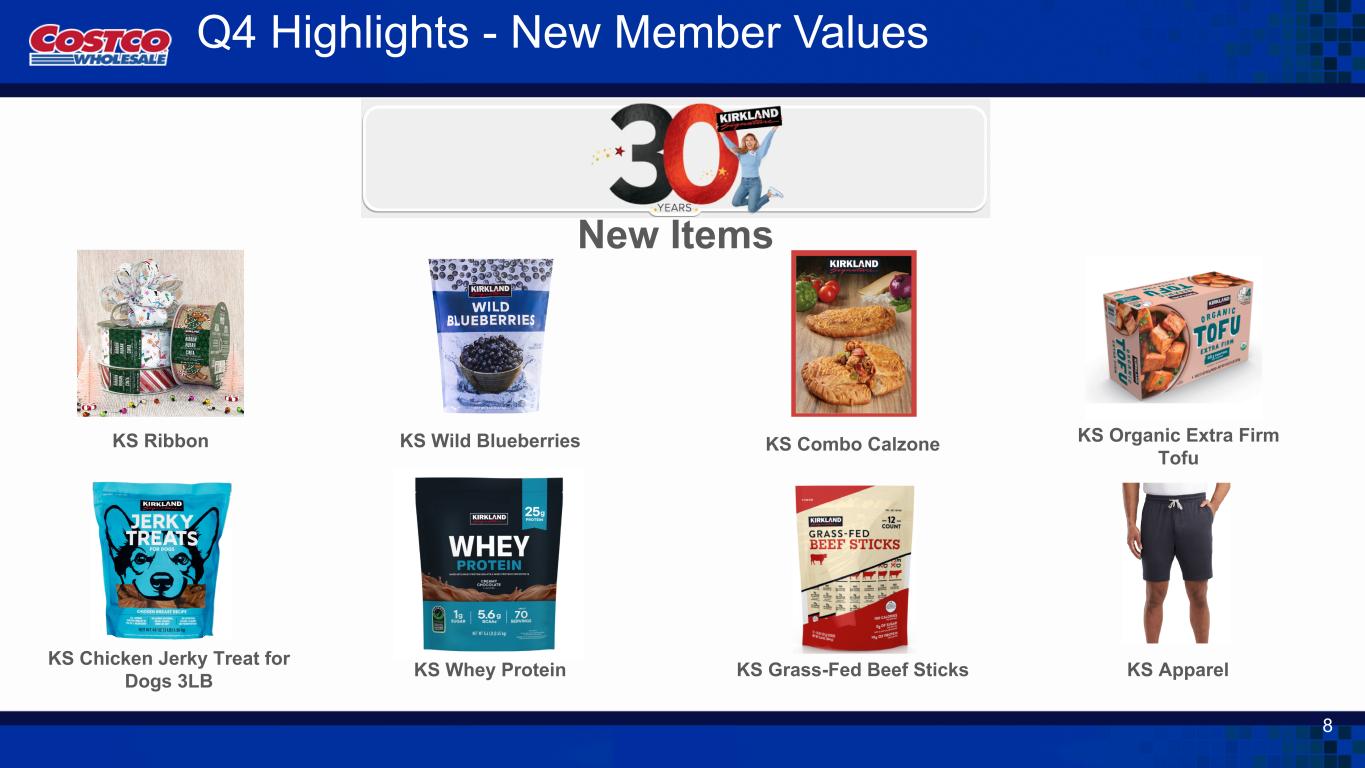 Q4 Highlights - New Member Values KS Apparel KS Organic Extra Firm Tofu 8 New Items KS Ribbon KS Wild Blueberries KS Grass-Fed Beef Sticks KS Combo Calzone KS Chicken Jerky Treat for Dogs 3LB KS Whey Protein