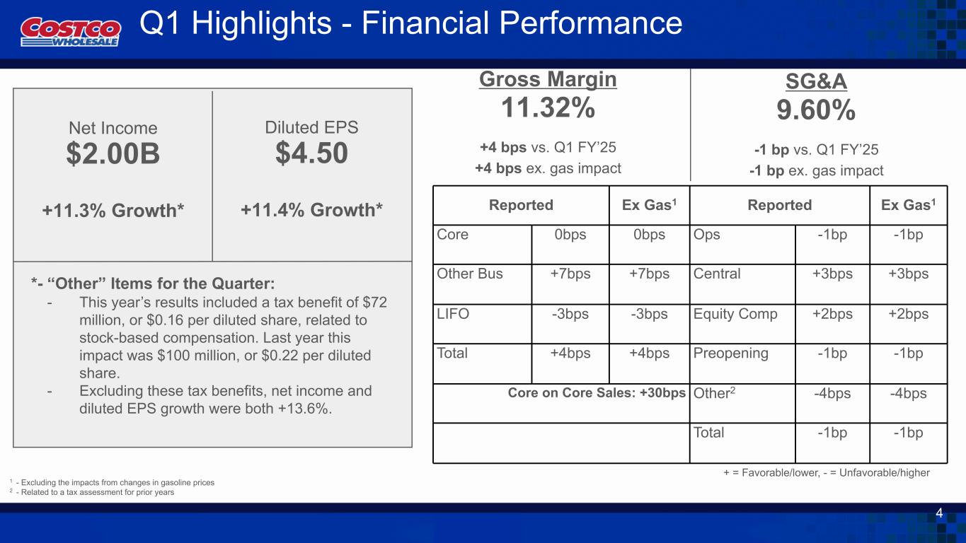Safe Harbor Certain statements contained in this document constitute forward-looking statements within the meaning of the Private Securities Litigation Reform Act of 1995. For these purposes, forward-looking statements are statements that address activities, events, conditions or developments that the Company expects or anticipates may occur in the future. In some cases forward-looking statements can be identified because they contain words such as “anticipate,” “believe,” “continue,” “could,” “estimate,” “expect,” “intend,” “likely,” “may,” “might,” “plan,” “potential,” “predict,” “project,” “seek,” “should,” “target,” “will,” “would,” or similar expressions and the negatives of those terms. Such forward-looking statements involve risks and uncertainties that may cause actual events, results or performance to differ materially from those indicated by such statements. These risks and uncertainties include, but are not limited to, domestic and international economic conditions, including exchange rates, inflation or deflation, the effects of competition and regulation, uncertainties in the financial markets, consumer and small business spending patterns and debt levels, breaches of security or privacy of member or business information, conditions affecting the acquisition, development, ownership or use of real estate, capital spending, actions of vendors, rising costs associated with employees (generally including health-care costs and wages), workforce interruptions, energy and certain commodities, geopolitical conditions (including tariffs), the ability to maintain effective internal control over financial reporting, regulatory and other impacts related to environmental and social matters, public- health related factors, and other risks identified from time to time in the Company’s public statements and reports filed with the Securities and Exchange Commission. Forward-looking statements speak only as of the date they are made, and the Company does not undertake to update these statements, except as required by law. Comparable sales and comparable sales excluding impacts from changes in gasoline prices and foreign exchange are intended as supplemental information and are not a substitute for net sales presented in accordance with U.S. GAAP. 9