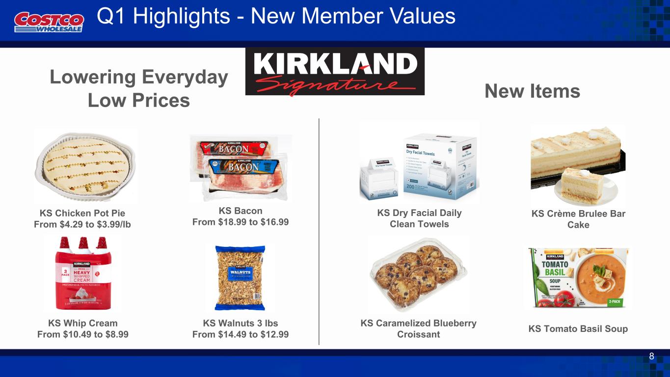 Q1 Highlights - New Member Values KS Tomato Basil Soup KS Crème Brulee Bar Cake 8 KS Chicken Pot Pie From $4.29 to $3.99/lb KS Bacon From $18.99 to $16.99 KS Caramelized Blueberry Croissant KS Dry Facial Daily Clean Towels KS Whip Cream From $10.49 to $8.99 KS Walnuts 3 lbs From $14.49 to $12.99 New Items Lowering Everyday Low Prices