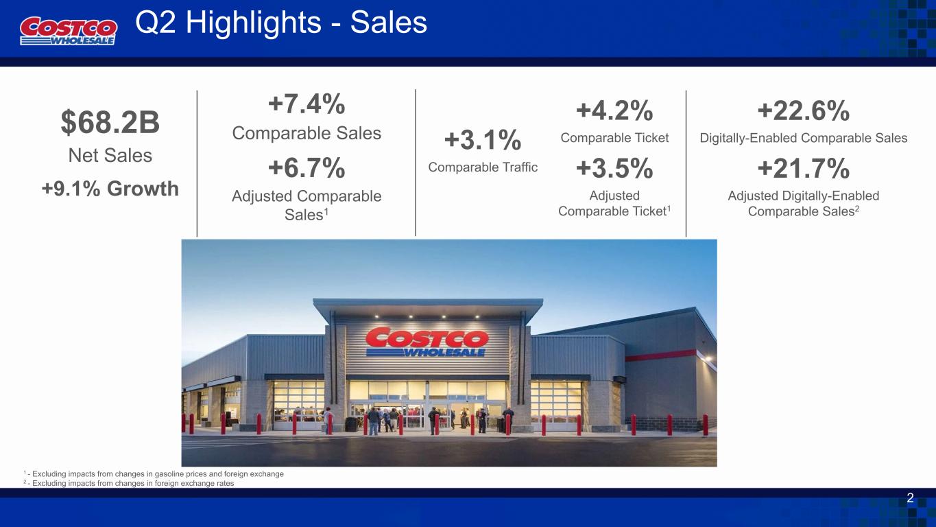 $68.2B Net Sales +9.1% Growth +7.4% Comparable Sales +6.7% Adjusted Comparable Sales1 +3.1% Comparable Traffic +22.6% Digitally-Enabled Comparable Sales +21.7% Adjusted Digitally-Enabled Comparable Sales2 Q2 Highlights - Sales 1 - Excluding impacts from changes in gasoline prices and foreign exchange 2 - Excluding impacts from changes in foreign exchange rates 2 +4.2% Comparable Ticket +3.5% Adjusted Comparable Ticket1