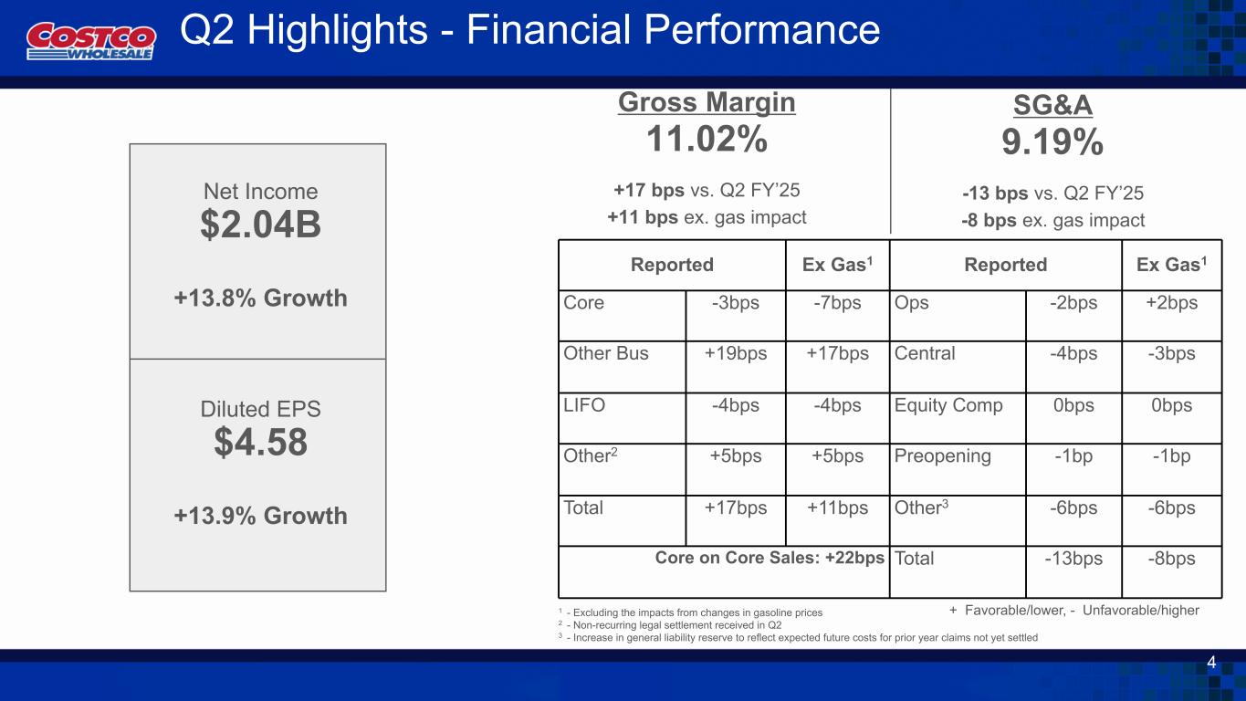 Q2 Highlights - Financial Performance Gross Margin 11.02% +17 bps vs. Q2 FY’25 +11 bps ex. gas impact SG&A 9.19% -13 bps vs. Q2 FY’25 -8 bps ex. gas impact 4 1 - Excluding the impacts from changes in gasoline prices 2 - Non-recurring legal settlement received in Q2 3 - Increase in general liability reserve to reflect expected future costs for prior year claims not yet settled Reported Ex Gas1 Reported Ex Gas1 Core -3bps -7bps Ops -2bps +2bps Other Bus +19bps +17bps Central -4bps -3bps LIFO -4bps -4bps Equity Comp 0bps 0bps Other2 +5bps +5bps Preopening -1bp -1bp Total +17bps +11bps Other3 -6bps -6bps Core on Core Sales: +22bps Total -13bps -8bps + Favorable/lower, - Unfavorable/higher Diluted EPS $4.58 +13.9% Growth Net Income $2.04B +13.8% Growth