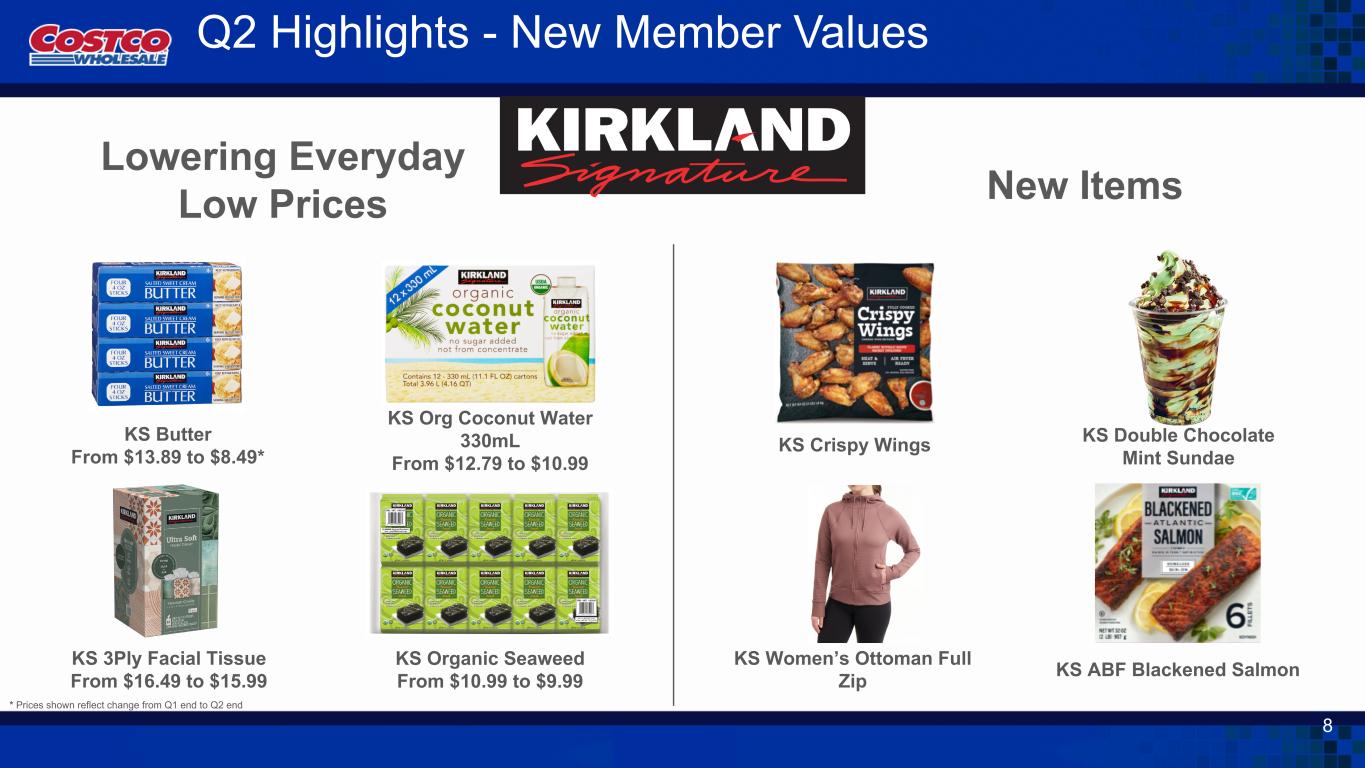 Q2 Highlights - New Member Values KS ABF Blackened Salmon KS Double Chocolate Mint Sundae 8 KS Butter From $13.89 to $8.49* KS Org Coconut Water 330mL From $12.79 to $10.99 KS Women’s Ottoman Full Zip KS Crispy Wings KS 3Ply Facial Tissue From $16.49 to $15.99 KS Organic Seaweed From $10.99 to $9.99 New Items Lowering Everyday Low Prices * Prices shown reflect change from Q1 end to Q2 end