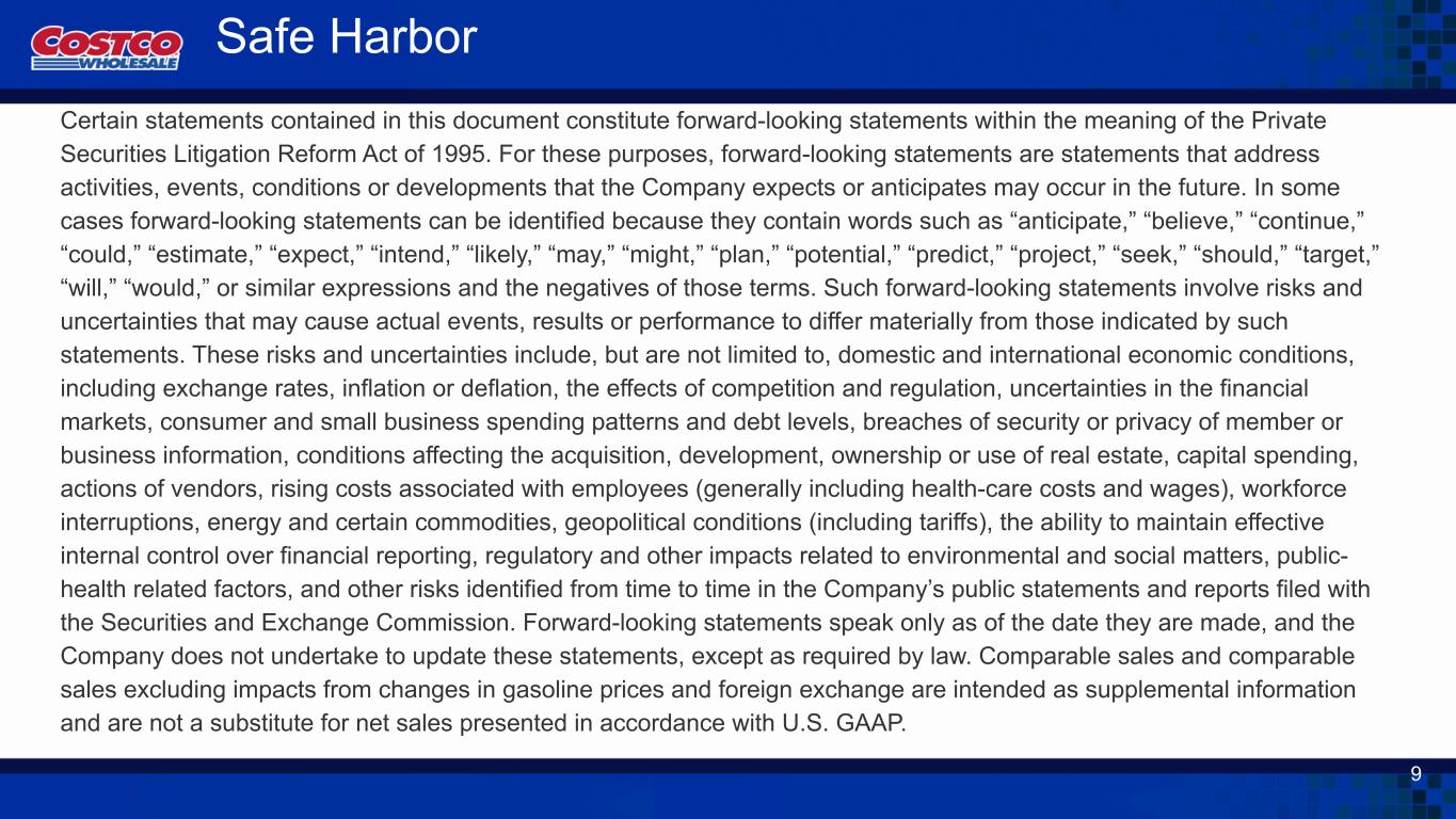 Safe Harbor Certain statements contained in this document constitute forward-looking statements within the meaning of the Private Securities Litigation Reform Act of 1995. For these purposes, forward-looking statements are statements that address activities, events, conditions or developments that the Company expects or anticipates may occur in the future. In some cases forward-looking statements can be identified because they contain words such as “anticipate,” “believe,” “continue,” “could,” “estimate,” “expect,” “intend,” “likely,” “may,” “might,” “plan,” “potential,” “predict,” “project,” “seek,” “should,” “target,” “will,” “would,” or similar expressions and the negatives of those terms. Such forward-looking statements involve risks and uncertainties that may cause actual events, results or performance to differ materially from those indicated by such statements. These risks and uncertainties include, but are not limited to, domestic and international economic conditions, including exchange rates, inflation or deflation, the effects of competition and regulation, uncertainties in the financial markets, consumer and small business spending patterns and debt levels, breaches of security or privacy of member or business information, conditions affecting the acquisition, development, ownership or use of real estate, capital spending, actions of vendors, rising costs associated with employees (generally including health-care costs and wages), workforce interruptions, energy and certain commodities, geopolitical conditions (including tariffs), the ability to maintain effective internal control over financial reporting, regulatory and other impacts related to environmental and social matters, public- health related factors, and other risks identified from time to time in the Company’s public statements and reports filed with the Securities and Exchange Commission. Forward-looking statements speak only as of the date they are made, and the Company does not undertake to update these statements, except as required by law. Comparable sales and comparable sales excluding impacts from changes in gasoline prices and foreign exchange are intended as supplemental information and are not a substitute for net sales presented in accordance with U.S. GAAP. 9