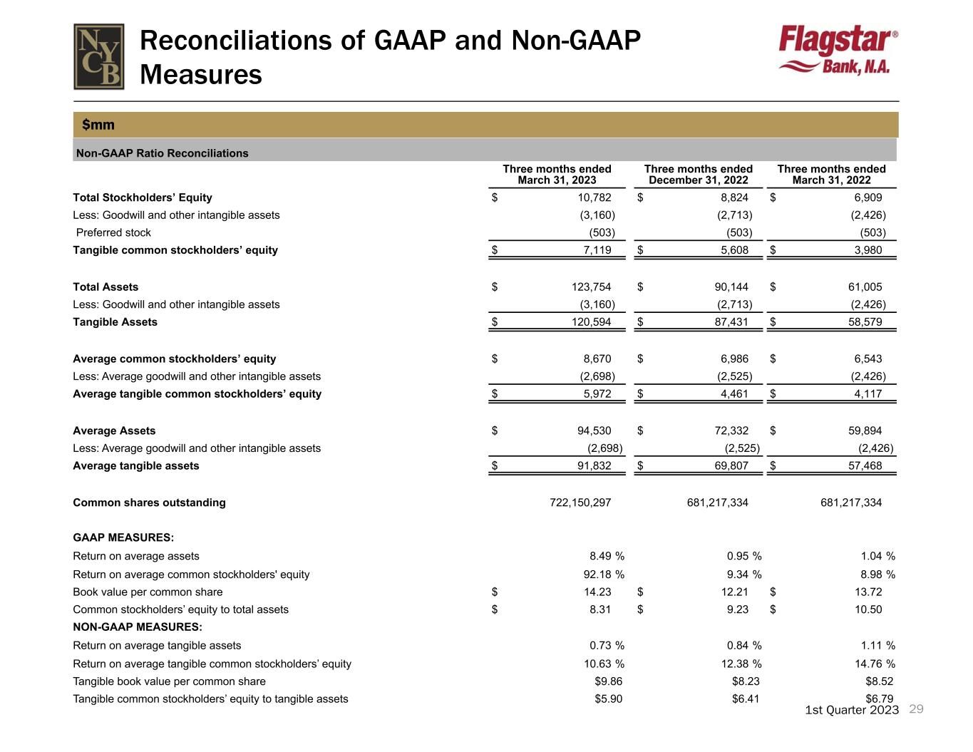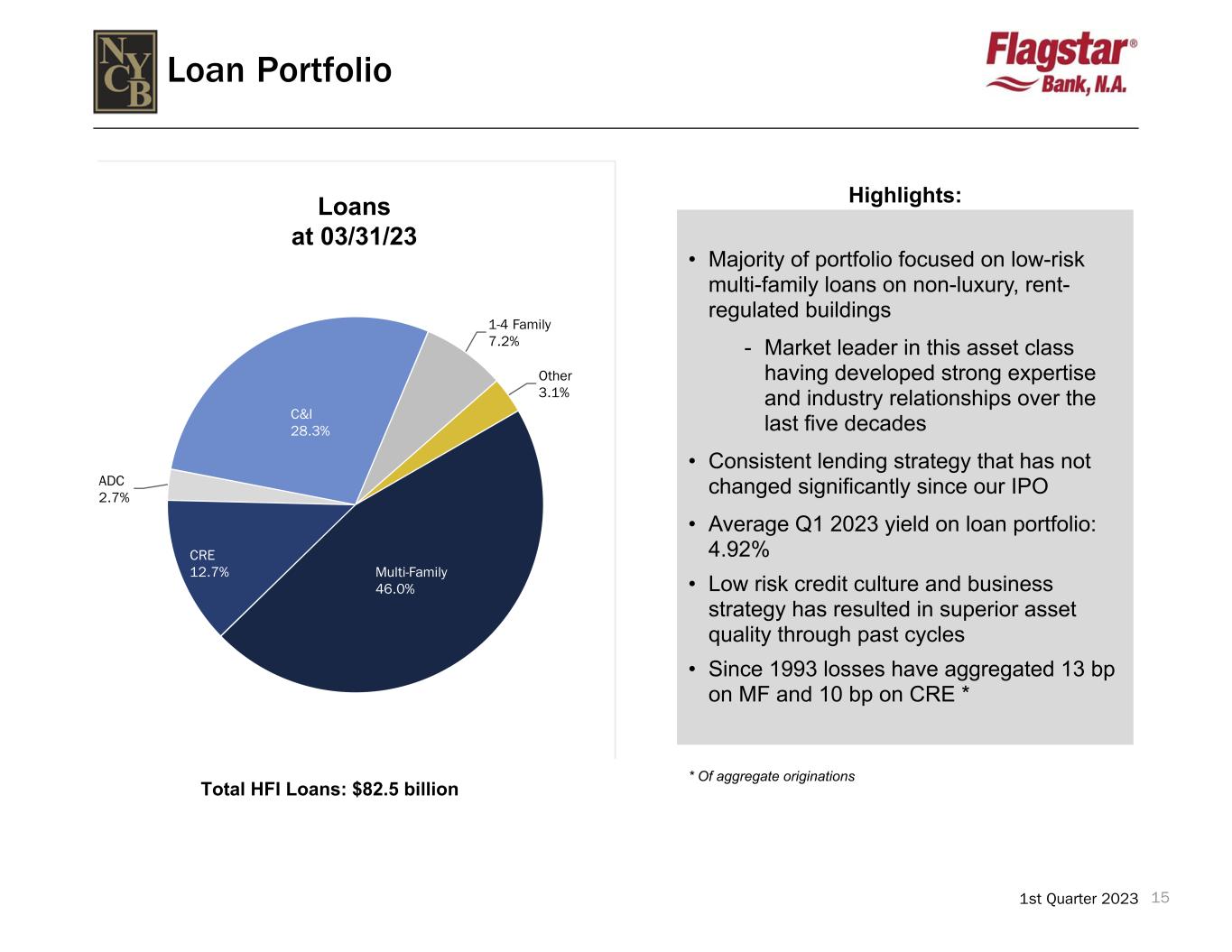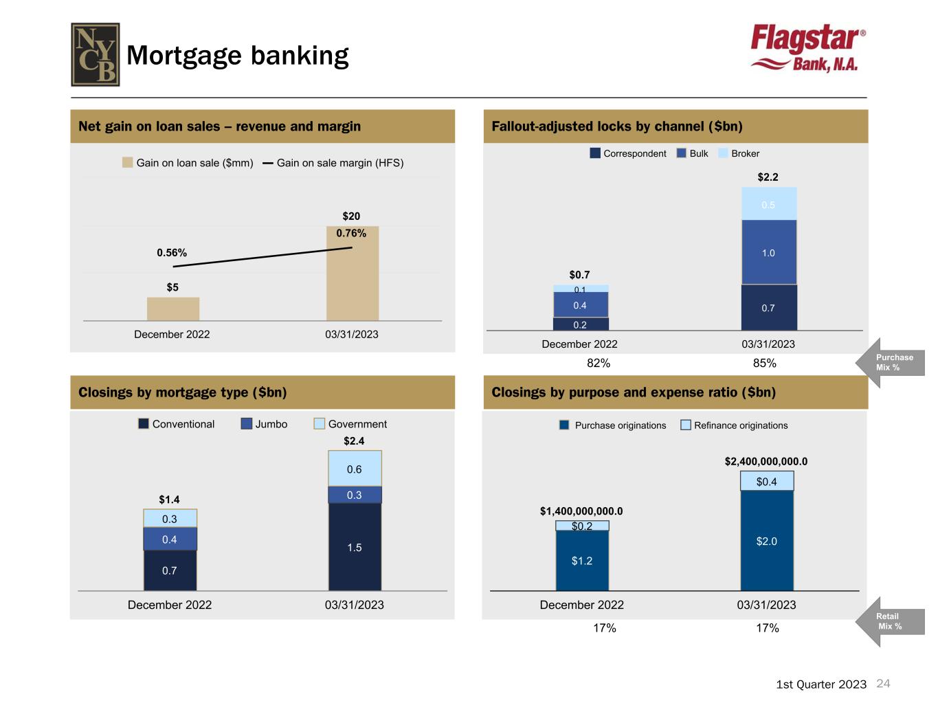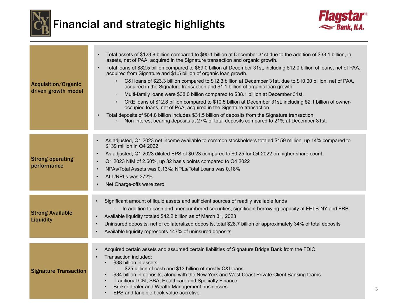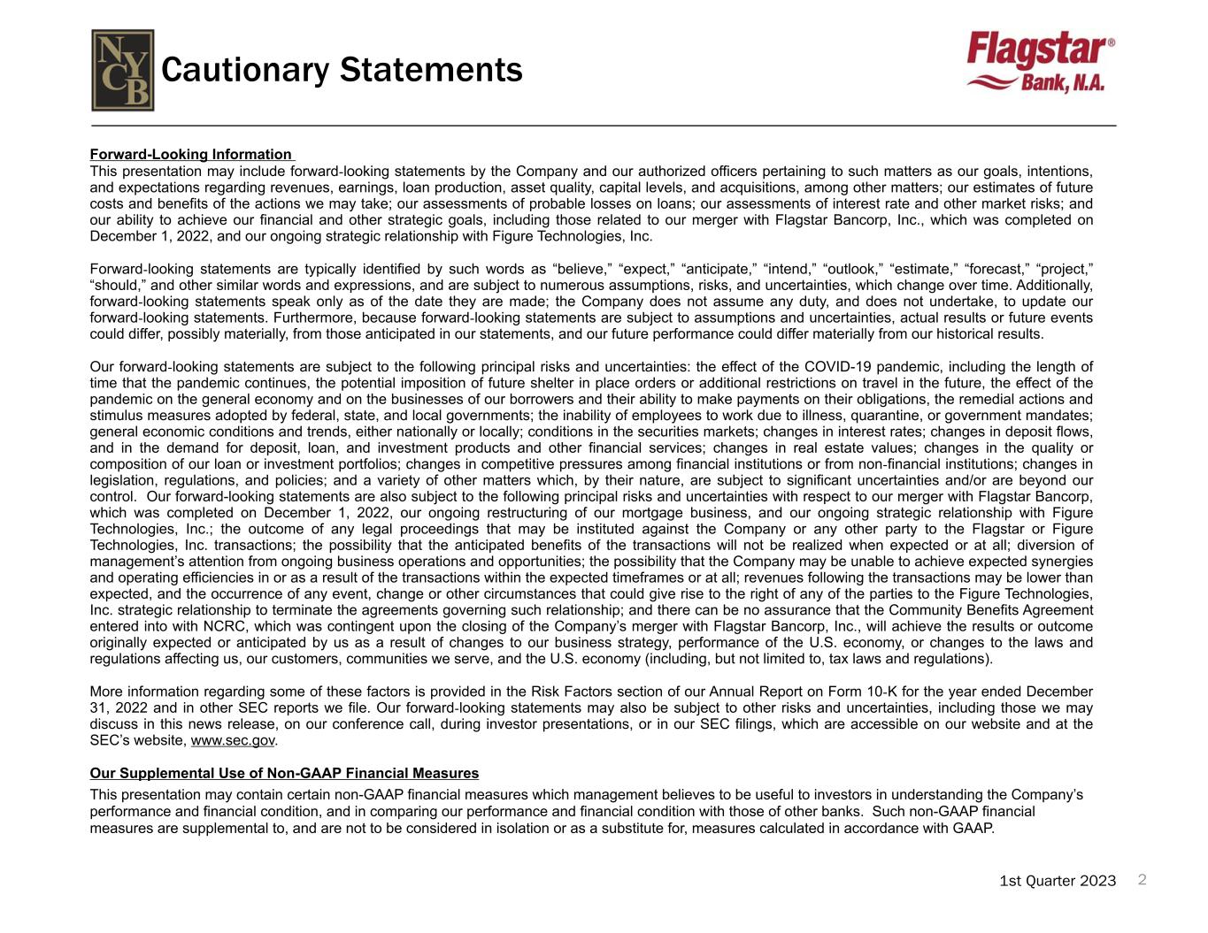 21st Quarter 2023 Forward-Looking Information This presentation may include forward-looking statements by the Company and our authorized officers pertaining to such matters as our goals, intentions, and expectations regarding revenues, earnings, loan production, asset quality, capital levels, and acquisitions, among other matters; our estimates of future costs and benefits of the actions we may take; our assessments of probable losses on loans; our assessments of interest rate and other market risks; and our ability to achieve our financial and other strategic goals, including those related to our merger with Flagstar Bancorp, Inc., which was completed on December 1, 2022, and our ongoing strategic relationship with Figure Technologies, Inc. Forward-looking statements are typically identified by such words as “believe,” “expect,” “anticipate,” “intend,” “outlook,” “estimate,” “forecast,” “project,” “should,” and other similar words and expressions, and are subject to numerous assumptions, risks, and uncertainties, which change over time. Additionally, forward-looking statements speak only as of the date they are made; the Company does not assume any duty, and does not undertake, to update our forward-looking statements. Furthermore, because forward-looking statements are subject to assumptions and uncertainties, actual results or future events could differ, possibly materially, from those anticipated in our statements, and our future performance could differ materially from our historical results. Our forward-looking statements are subject to the following principal risks and uncertainties: the effect of the COVID-19 pandemic, including the length of time that the pandemic continues, the potential imposition of future shelter in place orders or additional restrictions on travel in the future, the effect of the pandemic on the general economy and on the businesses of our borrowers and their ability to make payments on their obligations, the remedial actions and stimulus measures adopted by federal, state, and local governments; the inability of employees to work due to illness, quarantine, or government mandates; general economic conditions and trends, either nationally or locally; conditions in the securities markets; changes in interest rates; changes in deposit flows, and in the demand for deposit, loan, and investment products and other financial services; changes in real estate values; changes in the quality or composition of our loan or investment portfolios; changes in competitive pressures among financial institutions or from non-financial institutions; changes in legislation, regulations, and policies; and a variety of other matters which, by their nature, are subject to significant uncertainties and/or are beyond our control. Our forward-looking statements are also subject to the following principal risks and uncertainties with respect to our merger with Flagstar Bancorp, which was completed on December 1, 2022, our ongoing restructuring of our mortgage business, and our ongoing strategic relationship with Figure Technologies, Inc.; the outcome of any legal proceedings that may be instituted against the Company or any other party to the Flagstar or Figure Technologies, Inc. transactions; the possibility that the anticipated benefits of the transactions will not be realized when expected or at all; diversion of management’s attention from ongoing business operations and opportunities; the possibility that the Company may be unable to achieve expected synergies and operating efficiencies in or as a result of the transactions within the expected timeframes or at all; revenues following the transactions may be lower than expected, and the occurrence of any event, change or other circumstances that could give rise to the right of any of the parties to the Figure Technologies, Inc. strategic relationship to terminate the agreements governing such relationship; and there can be no assurance that the Community Benefits Agreement entered into with NCRC, which was contingent upon the closing of the Company’s merger with Flagstar Bancorp, Inc., will achieve the results or outcome originally expected or anticipated by us as a result of changes to our business strategy, performance of the U.S. economy, or changes to the laws and regulations affecting us, our customers, communities we serve, and the U.S. economy (including, but not limited to, tax laws and regulations). More information regarding some of these factors is provided in the Risk Factors section of our Annual Report on Form 10-K for the year ended December 31, 2022 and in other SEC reports we file. Our forward-looking statements may also be subject to other risks and uncertainties, including those we may discuss in this news release, on our conference call, during investor presentations, or in our SEC filings, which are accessible on our website and at the SEC’s website, www.sec.gov. Our Supplemental Use of Non-GAAP Financial Measures This presentation may contain certain non-GAAP financial measures which management believes to be useful to investors in understanding the Company’s performance and financial condition, and in comparing our performance and financial condition with those of other banks. Such non-GAAP financial measures are supplemental to, and are not to be considered in isolation or as a substitute for, measures calculated in accordance with GAAP. Cautionary Statements
