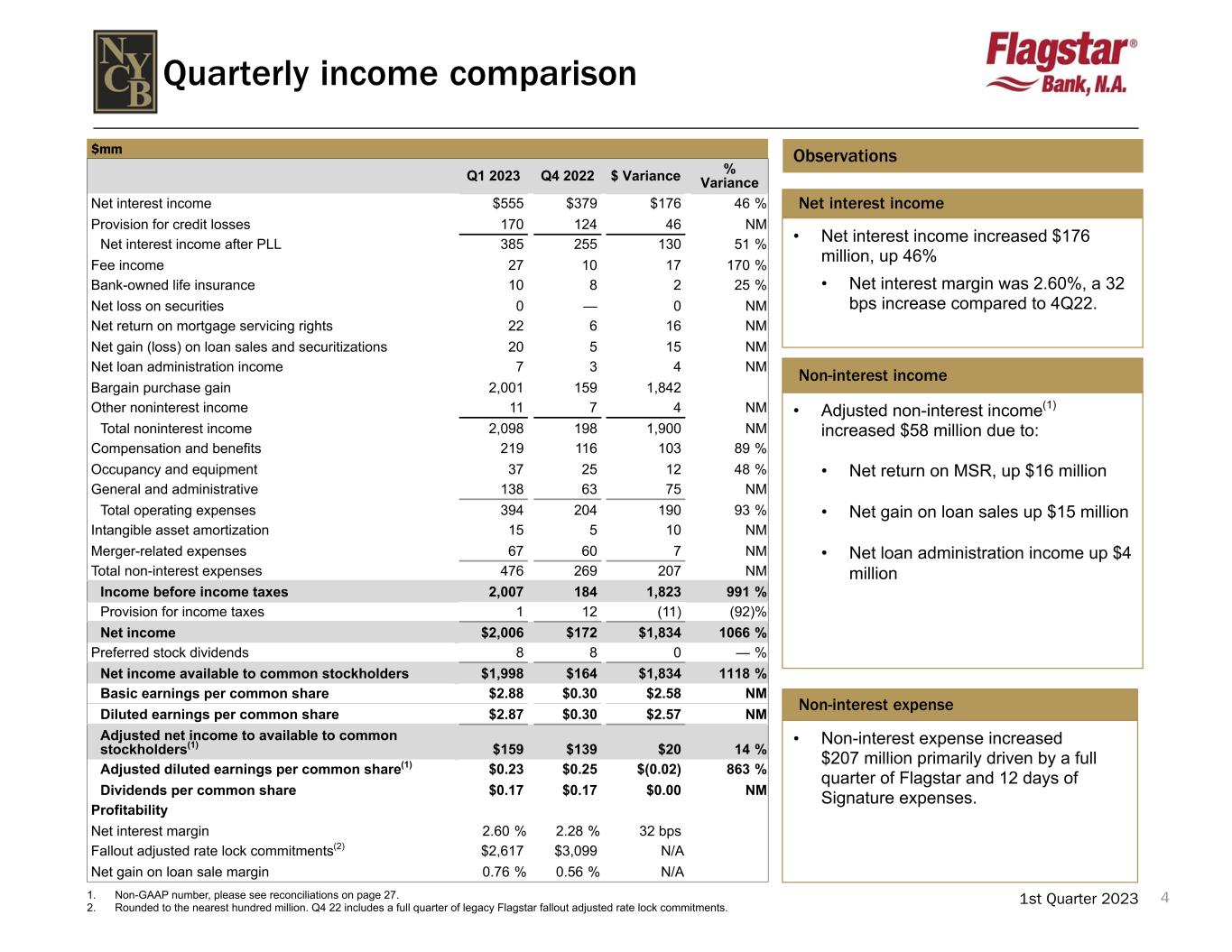 41st Quarter 2023 Observations • Adjusted non-interest income(1) increased $58 million due to: • Net return on MSR, up $16 million • Net gain on loan sales up $15 million • Net loan administration income up $4 million Non-interest income • Net interest income increased $176 million, up 46% • Net interest margin was 2.60%, a 32 bps increase compared to 4Q22. Net interest income • Non-interest expense increased $207 million primarily driven by a full quarter of Flagstar and 12 days of Signature expenses. Non-interest expense Quarterly income comparison 1. Non-GAAP number, please see reconciliations on page 27. 2. Rounded to the nearest hundred million. Q4 22 includes a full quarter of legacy Flagstar fallout adjusted rate lock commitments. $mm Q1 2023 Q4 2022 $ Variance % Variance Net interest income $555 $379 $176 46 % Provision for credit losses 170 124 46 NM Net interest income after PLL 385 255 130 51 % Fee income 27 10 17 170 % Bank-owned life insurance 10 8 2 25 % Net loss on securities 0 — 0 NM Net return on mortgage servicing rights 22 6 16 NM Net gain (loss) on loan sales and securitizations 20 5 15 NM Net loan administration income 7 3 4 NM Bargain purchase gain 2,001 159 1,842 Other noninterest income 11 7 4 NM Total noninterest income 2,098 198 1,900 NM Compensation and benefits 219 116 103 89 % Occupancy and equipment 37 25 12 48 % General and administrative 138 63 75 NM Total operating expenses 394 204 190 93 % Intangible asset amortization 15 5 10 NM Merger-related expenses 67 60 7 NM Total non-interest expenses 476 269 207 NM Income before income taxes 2,007 184 1,823 991 % Provision for income taxes 1 12 (11) (92) % Net income $2,006 $172 $1,834 1066 % Preferred stock dividends 8 8 0 — % Net income available to common stockholders $1,998 $164 $1,834 1118 % Basic earnings per common share $2.88 $0.30 $2.58 NM Diluted earnings per common share $2.87 $0.30 $2.57 NM Adjusted net income to available to common stockholders(1) $159 $139 $20 14 % Adjusted diluted earnings per common share(1) $0.23 $0.25 $(0.02) 863 % Dividends per common share $0.17 $0.17 $0.00 NM Profitability Net interest margin 2.60 % 2.28 % 32 bps Fallout adjusted rate lock commitments(2) $2,617 $3,099 N/A Net gain on loan sale margin 0.76 % 0.56 % N/A