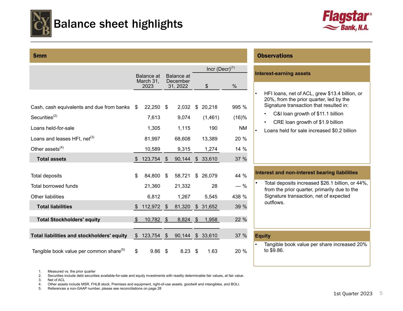 51st Quarter 2023 $mm Observations Balance sheet highlights Incr (Decr)(1) Balance at March 31, 2023 Balance at December 31, 2022 $ % Cash, cash equivalents and due from banks $ 22,250 $ 2,032 $ 20,218 995 % Securities(2) 7,613 9,074 (1,461) (16) % Loans held-for-sale 1,305 1,115 190 NM Loans and leases HFI, net(3) 81,997 68,608 13,389 20 % Other assets(4) 10,589 9,315 1,274 14 % Total assets $ 123,754 $ 90,144 $ 33,610 37 % Total deposits $ 84,800 $ 58,721 $ 26,079 44 % Total borrowed funds 21,360 21,332 28 — % Other liabilities 6,812 1,267 5,545 438 % Total liabilities $ 112,972 $ 81,320 $ 31,652 39 % Total Stockholders' equity $ 10,782 $ 8,824 $ 1,958 22 % Total liabilities and stockholders' equity $ 123,754 $ 90,144 $ 33,610 37 % Tangible book value per common share(5) $ 9.86 $ 8.23 $ 1.63 20 % 1. Measured vs. the prior quarter 2. Securities include debt securities available-for-sale and equity investments with readily determinable fair values, at fair value. 3. Net of ACL 4. Other assets include MSR, FHLB stock, Premises and equipment, right-of-use assets, goodwill and intangibles, and BOLI. 5. References a non-GAAP number, please see reconciliations on page 28 Interest and non-interest bearing liabilities • Total deposits increased $26.1 billion, or 44%, from the prior quarter, primarily due to the Signature transaction, net of expected outflows. Equity • Tangible book value per share increased 20% to $9.86. Interest-earning assets • HFI loans, net of ACL, grew $13.4 billion, or 20%, from the prior quarter, led by the Signature transaction that resulted in: • C&I loan growth of $11.1 billion • CRE loan growth of $1.9 billion • Loans held for sale increased $0.2 billion