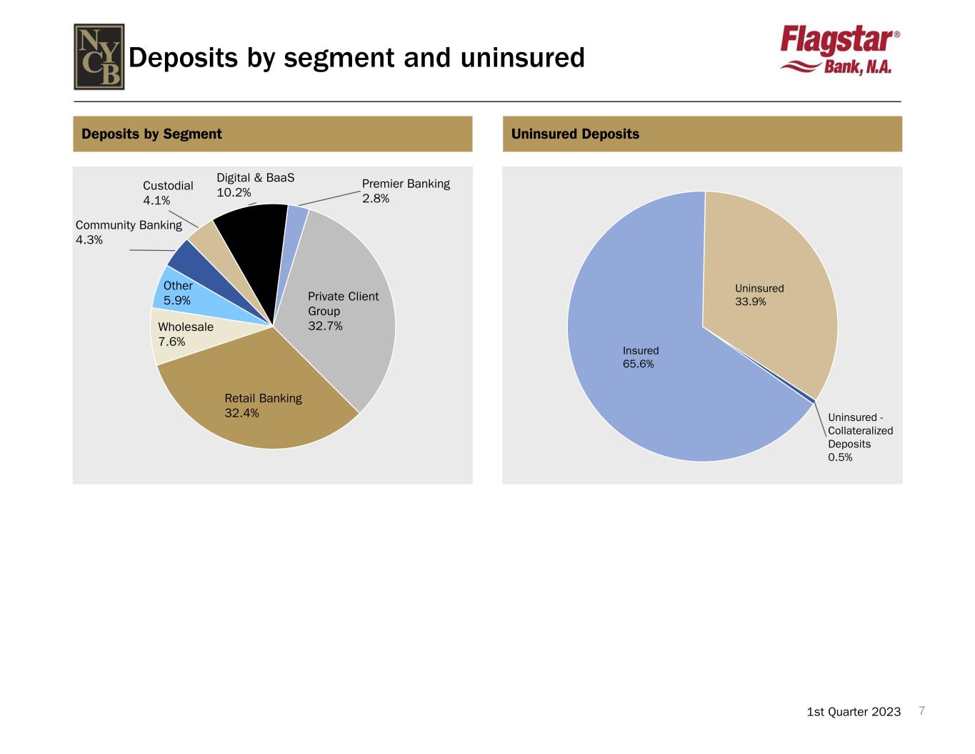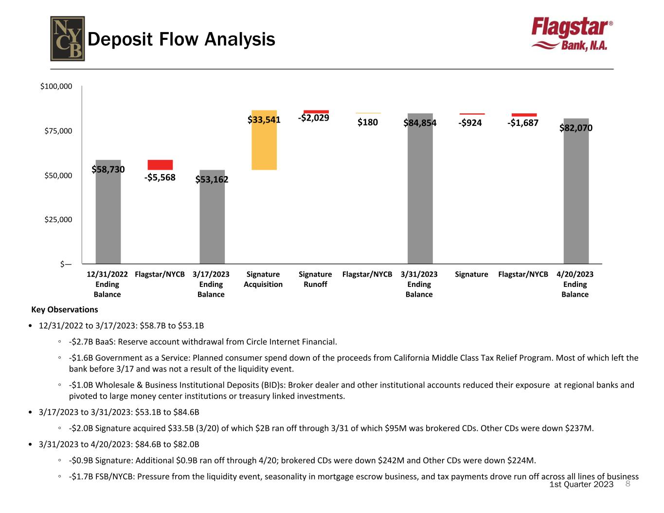 81st Quarter 2023 Deposit Flow Analysis Key Observations • 12/31/2022 to 3/17/2023: $58.7B to $53.1B ◦ -$2.7B BaaS: Reserve account withdrawal from Circle Internet Financial. ◦ -$1.6B Government as a Service: Planned consumer spend down of the proceeds from California Middle Class Tax Relief Program. Most of which left the bank before 3/17 and was not a result of the liquidity event. ◦ -$1.0B Wholesale & Business Institutional Deposits (BID)s: Broker dealer and other institutional accounts reduced their exposure at regional banks and pivoted to large money center institutions or treasury linked investments. • 3/17/2023 to 3/31/2023: $53.1B to $84.6B ◦ -$2.0B Signature acquired $33.5B (3/20) of which $2B ran off through 3/31 of which $95M was brokered CDs. Other CDs were down $237M. • 3/31/2023 to 4/20/2023: $84.6B to $82.0B ◦ -$0.9B Signature: Additional $0.9B ran off through 4/20; brokered CDs were down $242M and Other CDs were down $224M. ◦ -$1.7B FSB/NYCB: Pressure from the liquidity event, seasonality in mortgage escrow business, and tax payments drove run off across all lines of business $58,730 $53,162 $84,854 $82,070 $33,541 $180 12/31/2022 Ending Balance Flagstar/NYCB 3/17/2023 Ending Balance Signature Acquisition Signature Runoff Flagstar/NYCB 3/31/2023 Ending Balance Signature Flagstar/NYCB 4/20/2023 Ending Balance $— $25,000 $50,000 $75,000 $100,000 -$2,029 -$5,568 -$924 -$1,687