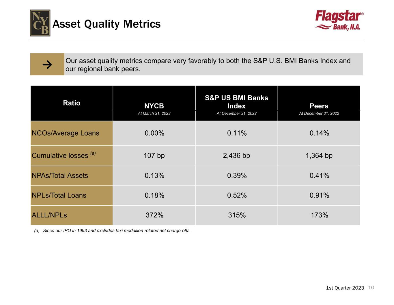 101st Quarter 2023 Asset Quality Metrics Ratio NYCB S&P US BMI Banks Index Peers At March 31, 2023 At December 31, 2022 At December 31, 2022 NCOs/Average Loans 0.00% 0.11% 0.14% Cumulative losses (a) 107 bp 2,436 bp 1,364 bp NPAs/Total Assets 0.13% 0.39% 0.41% NPLs/Total Loans 0.18% 0.52% 0.91% ALLL/NPLs 372% 315% 173% → Our asset quality metrics compare very favorably to both the S&P U.S. BMI Banks Index and our regional bank peers. (a) Since our IPO in 1993 and excludes taxi medallion-related net charge-offs.