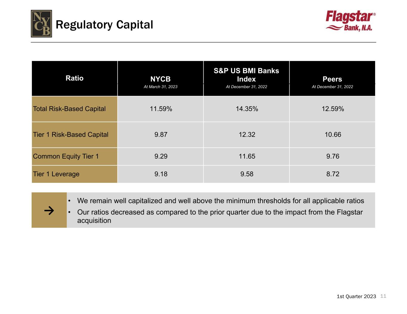 111st Quarter 2023 Regulatory Capital Ratio NYCB S&P US BMI Banks Index Peers At March 31, 2023 At December 31, 2022 At December 31, 2022 Total Risk-Based Capital 11.59% 14.35% 12.59% Tier 1 Risk-Based Capital 9.87 12.32 10.66 Common Equity Tier 1 9.29 11.65 9.76 Tier 1 Leverage 9.18 9.58 8.72 → • We remain well capitalized and well above the minimum thresholds for all applicable ratios • Our ratios decreased as compared to the prior quarter due to the impact from the Flagstar acquisition