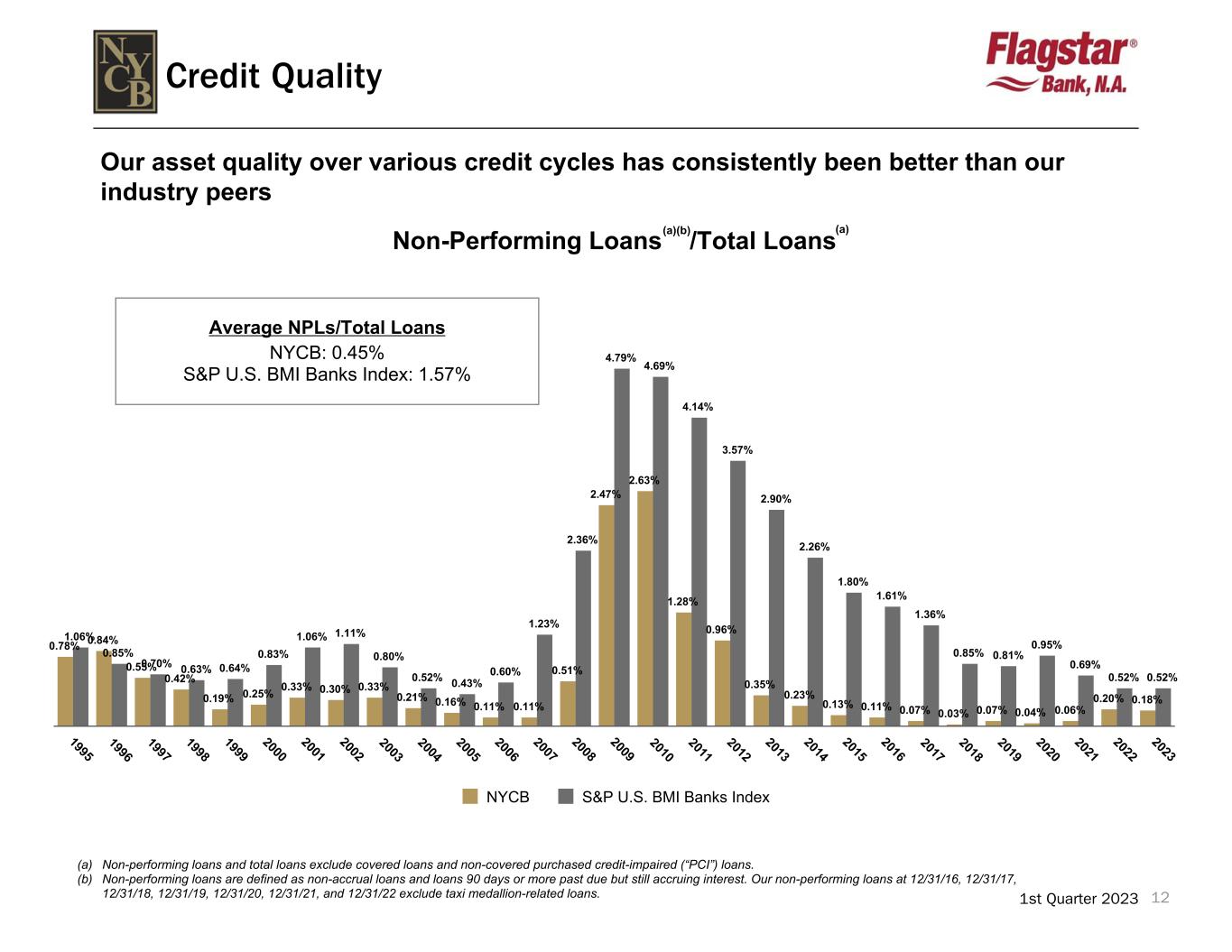 121st Quarter 2023 (a) Non-performing loans and total loans exclude covered loans and non-covered purchased credit-impaired (“PCI”) loans. (b) Non-performing loans are defined as non-accrual loans and loans 90 days or more past due but still accruing interest. Our non-performing loans at 12/31/16, 12/31/17, 12/31/18, 12/31/19, 12/31/20, 12/31/21, and 12/31/22 exclude taxi medallion-related loans. Credit Quality Non-Performing Loans /Total Loans 0.78% 0.84% 0.55% 0.42% 0.19% 0.25% 0.33% 0.30% 0.33% 0.21% 0.16% 0.11% 0.11% 0.51% 2.47% 2.63% 1.28% 0.96% 0.35% 0.23% 0.13% 0.11% 0.07% 0.03% 0.07% 0.04% 0.06% 0.20% 0.18% 1.06% 0.85% 0.70% 0.63% 0.64% 0.83% 1.06% 1.11% 0.80% 0.52% 0.43% 0.60% 1.23% 2.36% 4.79% 4.69% 4.14% 3.57% 2.90% 2.26% 1.80% 1.61% 1.36% 0.85% 0.81% 0.95% 0.69% 0.52% 0.52% NYCB S&P U.S. BMI Banks Index 1995 1996 1997 1998 1999 2000 2001 2002 2003 2004 2005 2006 2007 2008 2009 2010 2011 2012 2013 2014 2015 2016 2017 2018 2019 2020 2021 2022 2023 Average NPLs/Total Loans NYCB: 0.45% S&P U.S. BMI Banks Index: 1.57% (a)(b) (a) Our asset quality over various credit cycles has consistently been better than our industry peers