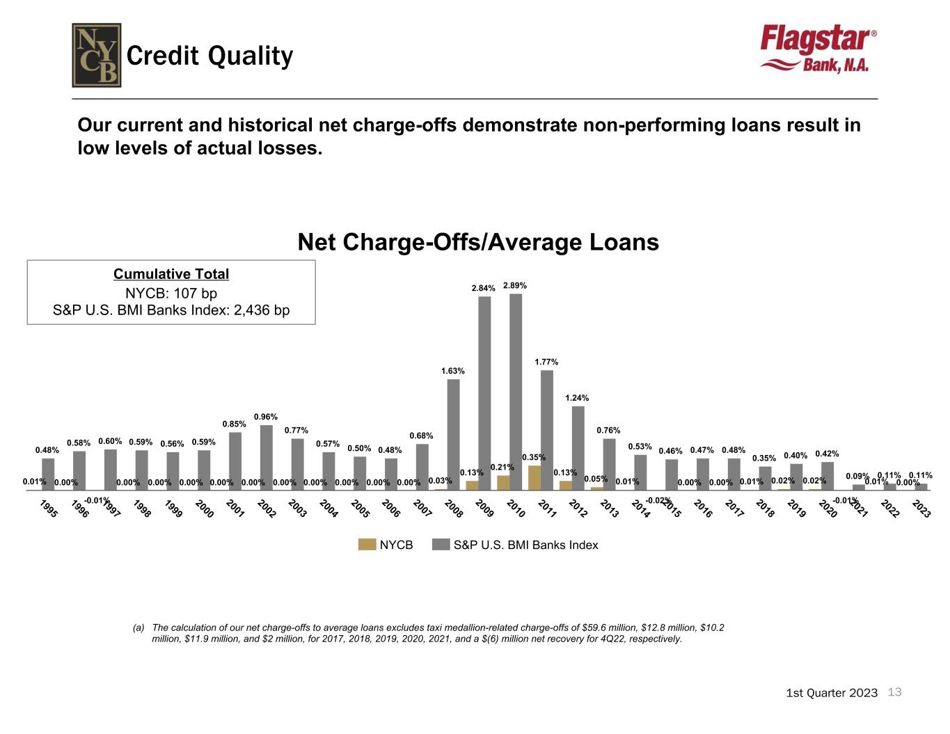 131st Quarter 2023 Credit Quality (a) The calculation of our net charge-offs to average loans excludes taxi medallion-related charge-offs of $59.6 million, $12.8 million, $10.2 million, $11.9 million, and $2 million, for 2017, 2018, 2019, 2020, 2021, and a $(6) million net recovery for 4Q22, respectively. Net Charge-Offs/Average Loans 0.01% 0.00% -0.01% 0.00% 0.00% 0.00% 0.00% 0.00% 0.00% 0.00% 0.00% 0.00% 0.00% 0.03% 0.13% 0.21% 0.35% 0.13% 0.05% 0.01% -0.02% 0.00% 0.00% 0.01% 0.02% 0.02% -0.01% 0.01% 0.00% 0.48% 0.58% 0.60% 0.59% 0.56% 0.59% 0.85% 0.96% 0.77% 0.57% 0.50% 0.48% 0.68% 1.63% 2.84% 2.89% 1.77% 1.24% 0.76% 0.53% 0.46% 0.47% 0.48% 0.35% 0.40% 0.42% 0.09% 0.11% 0.11% NYCB S&P U.S. BMI Banks Index 1995 1996 1997 1998 1999 2000 2001 2002 2003 2004 2005 2006 2007 2008 2009 2010 2011 2012 2013 2014 2015 2016 2017 2018 2019 2020 2021 2022 2023 Cumulative Total NYCB: 107 bp S&P U.S. BMI Banks Index: 2,436 bp Our current and historical net charge-offs demonstrate non-performing loans result in low levels of actual losses.