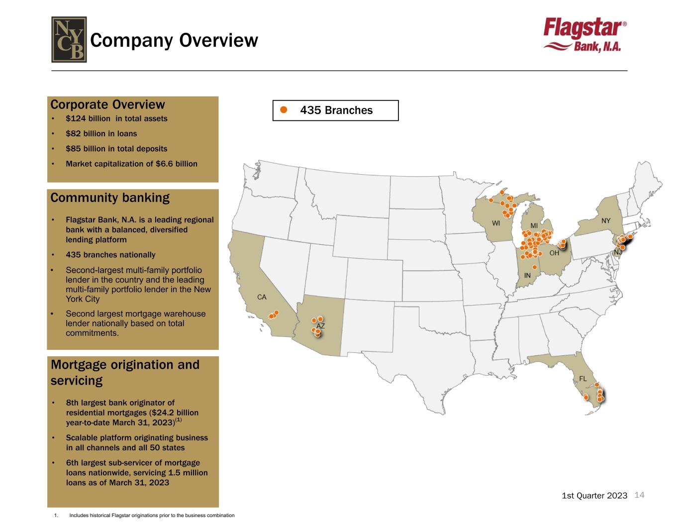 141st Quarter 2023 Community banking • Flagstar Bank, N.A. is a leading regional bank with a balanced, diversified lending platform • 435 branches nationally • Second-largest multi-family portfolio lender in the country and the leading multi-family portfolio lender in the New York City • Second largest mortgage warehouse lender nationally based on total commitments. Mortgage origination and servicing • 8th largest bank originator of residential mortgages ($24.2 billion year-to-date March 31, 2023)(1) • Scalable platform originating business in all channels and all 50 states • 6th largest sub-servicer of mortgage loans nationwide, servicing 1.5 million loans as of March 31, 2023 Corporate Overview • $124 billion in total assets • $82 billion in loans • $85 billion in total deposits • Market capitalization of $6.6 billion Company Overview l 435 Branches 1. Includes historical Flagstar originations prior to the business combination