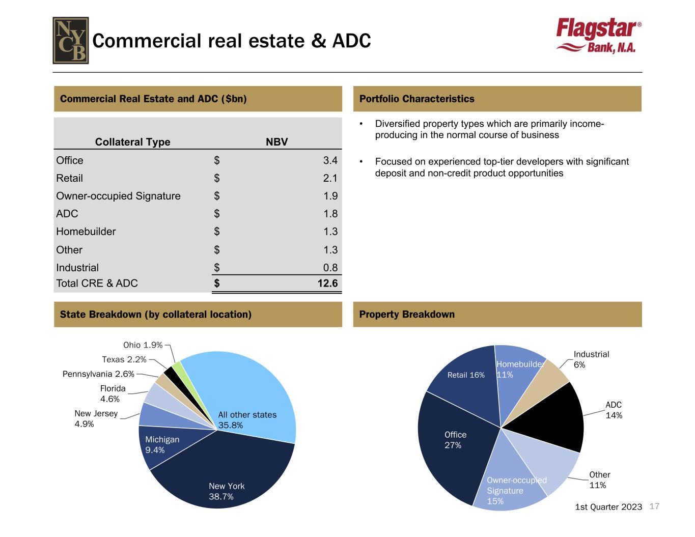 171st Quarter 2023 • Diversified property types which are primarily income- producing in the normal course of business • Focused on experienced top-tier developers with significant deposit and non-credit product opportunities Commercial Real Estate and ADC ($bn) Commercial real estate & ADC Portfolio Characteristics State Breakdown (by collateral location) Property Breakdown Collateral Type NBV Office $ 3.4 Retail $ 2.1 Owner-occupied Signature $ 1.9 ADC $ 1.8 Homebuilder $ 1.3 Other $ 1.3 Industrial $ 0.8 Total CRE & ADC $ 12.6 New York 38.7% Michigan 9.4% New Jersey 4.9% Florida 4.6% Pennsylvania 2.6% Texas 2.2% Ohio 1.9% All other states 35.8% Office 27% Retail 16% Homebuilder 11% Industrial 6% ADC 14% Other 11%Owner-occupied Signature 15%