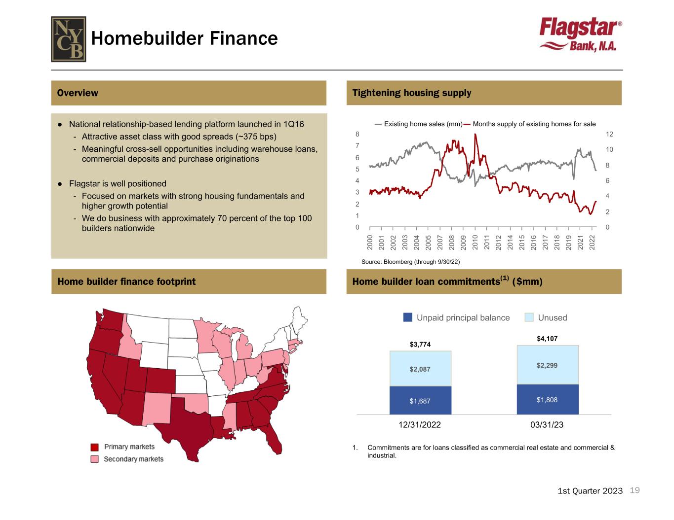 191st Quarter 2023 Home builder loan commitments(1) ($mm) ● National relationship-based lending platform launched in 1Q16 - Attractive asset class with good spreads (~375 bps) - Meaningful cross-sell opportunities including warehouse loans, commercial deposits and purchase originations ● Flagstar is well positioned - Focused on markets with strong housing fundamentals and higher growth potential - We do business with approximately 70 percent of the top 100 builders nationwide Home builder finance footprint Overview Tightening housing supply 1. Commitments are for loans classified as commercial real estate and commercial & industrial. $3,774 $4,107 $1,687 $1,808 $2,087 $2,299 Unpaid principal balance Unused 12/31/2022 03/31/23 Existing home sales (mm) Months supply of existing homes for sale 20 00 20 01 20 02 20 03 20 04 20 05 20 07 20 08 20 09 20 10 20 11 20 12 20 14 20 15 20 16 20 17 20 18 20 19 20 21 20 22 0 1 2 3 4 5 6 7 8 0 2 4 6 8 10 12 Source: Bloomberg (through 9/30/22) Homebuilder Finance