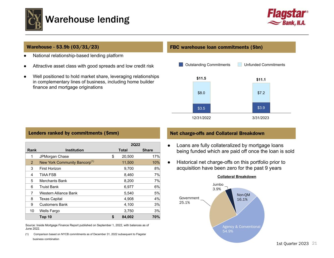 211st Quarter 2023 FBC warehouse loan commitments ($bn) Warehouse lending Lenders ranked by commitments ($mm) Source: Inside Mortgage Finance Report published on September 1, 2022, with balances as of June 2022. ● National relationship-based lending platform ● Attractive asset class with good spreads and low credit risk ● Well positioned to hold market share, leveraging relationships in complementary lines of business, including home builder finance and mortgage originations Net charge-offs and Collateral Breakdown 6 bps annual loss rate since 2006 $11.5 $11.1 $3.5 $3.9 $8.0 $7.2 Outstanding Commitments Unfunded Commitments 12/31/2022 3/31/2023 2Q22 Rank Institution Total Share 1 JPMorgan Chase $ 20,500 17 % 2 New York Community Bancorp(1) 11,500 10 % 3 First Horizon 9,700 8 % 4 TIAA FSB 8,460 7 % 5 Merchants Bank 8,200 7 % 6 Truist Bank 6,977 6 % 7 Western Alliance Bank 5,540 5 % 8 Texas Capital 4,908 4 % 9 Customers Bank 4,100 3 % 10 Wells Fargo 3,750 3 % Top 10 $ 84,002 70 % ● Loans are fully collateralized by mortgage loans being funded which are paid off once the loan is sold ● Historical net charge-offs on this portfolio prior to acquisition have been zero for the past 9 years Collateral Breakdown Agency & Conventional 54.9% Government 25.1% Jumbo 3.9% Non-QM 16.1% Warehouse - $3.9b (03/31/23) (1) Comparison based on NYCB commitments as of December 31, 2022 subsequent to Flagstar business combination