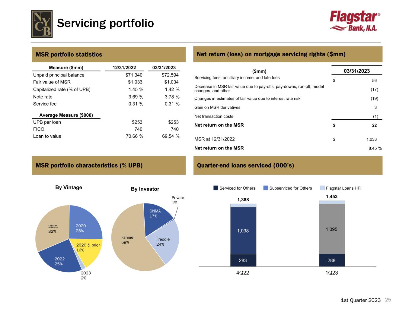 251st Quarter 2023 154 7 35 Servicing portfolio MSR portfolio characteristics (% UPB) MSR portfolio statistics Net return (loss) on mortgage servicing rights ($mm) By Vintage 2023 2% 2022 25% 2021 32% 2020 25% 2020 & prior 16% By Investor Freddie 24% Fannie 59% GNMA 17% Private 1% Measure ($mm) 12/31/2022 03/31/2023 Unpaid principal balance $71,340 $72,594 Fair value of MSR $1,033 $1,034 Capitalized rate (% of UPB) 1.45 % 1.42 % Note rate 3.69 % 3.78 % Service fee 0.31 % 0.31 % Average Measure ($000) UPB per loan $253 $253 FICO 740 740 Loan to value 70.66 % 69.54 % ($mm) 03/31/2023 Servicing fees, ancilliary income, and late fees $ 56 Decrease in MSR fair value due to pay-offs, pay-downs, run-off, model changes, and other (17) Changes in estimates of fair value due to interest rate risk (19) Gain on MSR derivatives 3 Net transaction costs (1) Net return on the MSR $ 22 MSR at 12/31/2022 $ 1,033 Net return on the MSR 8.45 % Quarter-end loans serviced (000’s) 1,388 1,453 283 288 1,038 1,095 Serviced for Others Subserviced for Others Flagstar Loans HFI 4Q22 1Q23