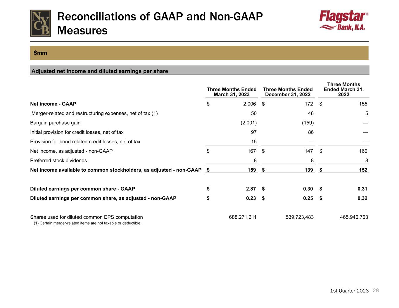 281st Quarter 2023 Adjusted net income and diluted earnings per share Three Months Ended March 31, 2023 Three Months Ended December 31, 2022 Three Months Ended March 31, 2022 Net income - GAAP $ 2,006 $ 172 $ 155 Merger-related and restructuring expenses, net of tax (1) 50 48 5 Bargain purchase gain (2,001) (159) — Initial provision for credit losses, net of tax 97 86 — Provision for bond related credit losses, net of tax 15 — — Net income, as adjusted - non-GAAP $ 167 $ 147 $ 160 Preferred stock dividends 8 8 8 Net income available to common stockholders, as adjusted - non-GAAP $ 159 $ 139 $ 152 Diluted earnings per common share - GAAP $ 2.87 $ 0.30 $ 0.31 Diluted earnings per common share, as adjusted - non-GAAP $ 0.23 $ 0.25 $ 0.32 Shares used for diluted common EPS computation 688,271,611 539,723,483 465,946,763 Reconciliations of GAAP and Non-GAAP Measures $mm (1) Certain merger-related items are not taxable or deductible.