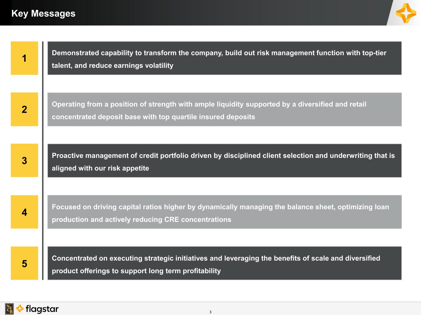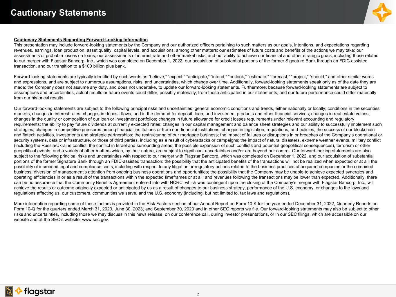 Cautionary Statements Cautionary Statements Regarding Forward-Looking Information This presentation may include forward‐looking statements by the Company and our authorized officers pertaining to such matters as our goals, intentions, and expectations regarding revenues, earnings, loan production, asset quality, capital levels, and acquisitions, among other matters; our estimates of future costs and benefits of the actions we may take; our assessments of probable losses on loans; our assessments of interest rate and other market risks; and our ability to achieve our financial and other strategic goals, including those related to our merger with Flagstar Bancorp, Inc., which was completed on December 1, 2022, our acquisition of substantial portions of the former Signature Bank through an FDIC-assisted transaction, and our transition to a $100 billion plus bank. Forward‐looking statements are typically identified by such words as “believe,” “expect,” “anticipate,” “intend,” “outlook,” “estimate,” “forecast,” “project,” “should,” and other similar words and expressions, and are subject to numerous assumptions, risks, and uncertainties, which change over time. Additionally, forward‐looking statements speak only as of the date they are made; the Company does not assume any duty, and does not undertake, to update our forward‐looking statements. Furthermore, because forward‐looking statements are subject to assumptions and uncertainties, actual results or future events could differ, possibly materially, from those anticipated in our statements, and our future performance could differ materially from our historical results. Our forward‐looking statements are subject to the following principal risks and uncertainties: general economic conditions and trends, either nationally or locally; conditions in the securities markets; changes in interest rates; changes in deposit flows, and in the demand for deposit, loan, and investment products and other financial services; changes in real estate values; changes in the quality or composition of our loan or investment portfolios; changes in future allowance for credit losses requirements under relevant accounting and regulatory requirements; the ability to pay future dividends at currently expected rates; changes in our capital management and balance sheet strategies and our ability to successfully implement such strategies; changes in competitive pressures among financial institutions or from non‐financial institutions; changes in legislation, regulations, and policies; the success of our blockchain and fintech activities, investments and strategic partnerships; the restructuring of our mortgage business; the impact of failures or disruptions in or breaches of the Company’s operational or security systems, data or infrastructure, or those of third parties, including as a result of cyberattacks or campaigns; the impact of natural disasters, extreme weather events, military conflict (including the Russia/Ukraine conflict, the conflict in Israel and surrounding areas, the possible expansion of such conflicts and potential geopolitical consequences), terrorism or other geopolitical events; and a variety of other matters which, by their nature, are subject to significant uncertainties and/or are beyond our control. Our forward-looking statements are also subject to the following principal risks and uncertainties with respect to our merger with Flagstar Bancorp, which was completed on December 1, 2022, and our acquisition of substantial portions of the former Signature Bank through an FDIC-assisted transaction: the possibility that the anticipated benefits of the transactions will not be realized when expected or at all; the possibility of increased legal and compliance costs, including with respect to any litigation or regulatory actions related to the business practices of acquired companies or the combined business; diversion of management’s attention from ongoing business operations and opportunities; the possibility that the Company may be unable to achieve expected synergies and operating efficiencies in or as a result of the transactions within the expected timeframes or at all; and revenues following the transactions may be lower than expected. Additionally, there can be no assurance that the Community Benefits Agreement entered into with NCRC, which was contingent upon the closing of the Company’s merger with Flagstar Bancorp, Inc., will achieve the results or outcome originally expected or anticipated by us as a result of changes to our business strategy, performance of the U.S. economy, or changes to the laws and regulations affecting us, our customers, communities we serve, and the U.S. economy (including, but not limited to, tax laws and regulations). More information regarding some of these factors is provided in the Risk Factors section of our Annual Report on Form 10‐K for the year ended December 31, 2022, Quarterly Reports on Form 10-Q for the quarters ended March 31, 2023, June 30, 2023, and September 30, 2023 and in other SEC reports we file. Our forward‐looking statements may also be subject to other risks and uncertainties, including those we may discuss in this news release, on our conference call, during investor presentations, or in our SEC filings, which are accessible on our website and at the SEC’s website, www.sec.gov. 2