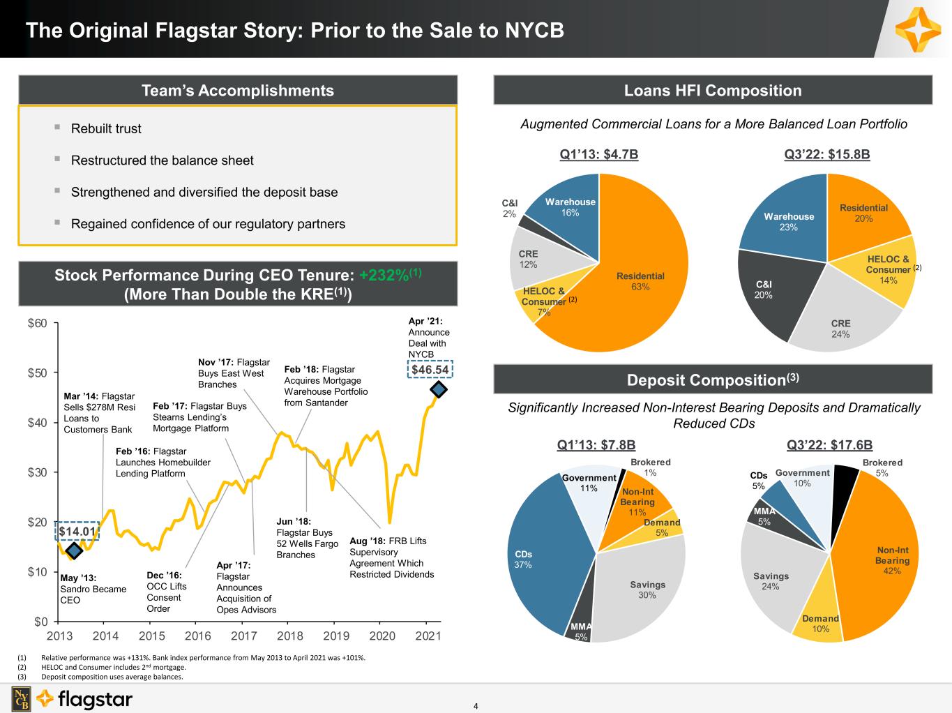 Loans HFI Composition Stock Performance During CEO Tenure: +232%(1) (More Than Double the KRE(1)) The Original Flagstar Story: Prior to the Sale to NYCB $14.01 $46.54 $0 $10 $20 $30 $40 $50 $60 2013 2014 2015 2016 2017 2018 2019 2020 2021 May ’13: Sandro Became CEO Mar ’14: Flagstar Sells $278M Resi Loans to Customers Bank Dec ’16: OCC Lifts Consent Order Feb ’17: Flagstar Buys Stearns Lending’s Mortgage Platform Apr ’21: Announce Deal with NYCB Apr ’17: Flagstar Announces Acquisition of Opes Advisors Nov ’17: Flagstar Buys East West Branches Jun ’18: Flagstar Buys 52 Wells Fargo Branches Aug ’18: FRB Lifts Supervisory Agreement Which Restricted Dividends Feb ’18: Flagstar Acquires Mortgage Warehouse Portfolio from Santander (1) Relative performance was +131%. Bank index performance from May 2013 to April 2021 was +101%. (2) HELOC and Consumer includes 2nd mortgage. (3) Deposit composition uses average balances. Team’s Accomplishments  Rebuilt trust  Restructured the balance sheet  Strengthened and diversified the deposit base  Regained confidence of our regulatory partners Deposit Composition(3) Q1’13: $4.7B Residential 63%HELOC & Consumer 7% CRE 12% C&I 2% Warehouse 16% Residential 20% HELOC & Consumer 14% CRE 24% C&I 20% Warehouse 23% Q3’22: $15.8B Augmented Commercial Loans for a More Balanced Loan Portfolio Significantly Increased Non-Interest Bearing Deposits and Dramatically Reduced CDs Q1’13: $7.8B Non-Int Bearing 11% Demand 5% Savings 30% MMA 5% CDs 37% Government 11% Brokered 1% Q3’22: $17.6B Non-Int Bearing 42% Demand 10% Savings 24% MMA 5% CDs 5% Government 10% Brokered 5% (2) (2) Feb ’16: Flagstar Launches Homebuilder Lending Platform 4