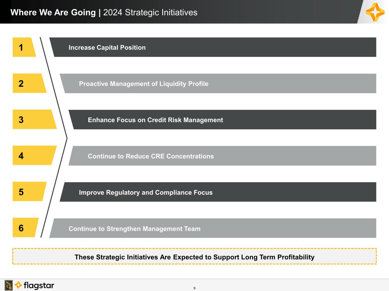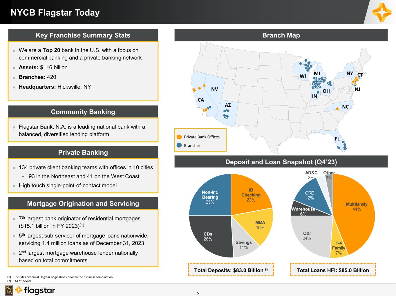 Multifamily 44% 1-4 Family 7% C&I 24% Warehouse 6% CRE 12% AD&C 3% Other 3% NYCB Flagstar Today Key Franchise Summary Stats  We are a Top 20 bank in the U.S. with a focus on commercial banking and a private banking network  Assets: $116 billion  Branches: 420  Headquarters: Hicksville, NY Community Banking  Flagstar Bank, N.A. is a leading national bank with a balanced, diversified lending platform Private Banking  134 private client banking teams with offices in 10 cities - 93 in the Northeast and 41 on the West Coast  High touch single-point-of-contact model Mortgage Origination and Servicing  7th largest bank originator of residential mortgages ($15.1 billion in FY 2023)(1)  5th largest sub-servicer of mortgage loans nationwide, servicing 1.4 million loans as of December 31, 2023  2nd largest mortgage warehouse lender nationally based on total commitments (1) Includes historical Flagstar originations prior to the business combination. (2) As of 2/5/24. Deposit and Loan Snapshot (Q4’23) Branch Map IB Checking 22% MMA 16% Savings 11% CDs 26% Non-Int. Bearing 25% Total Deposits: $83.0 Billion(2) Total Loans HFI: $85.0 Billion CA AZ FL WI MI IN OH NY NJ NC NV CT Branches Private Bank Offices 5