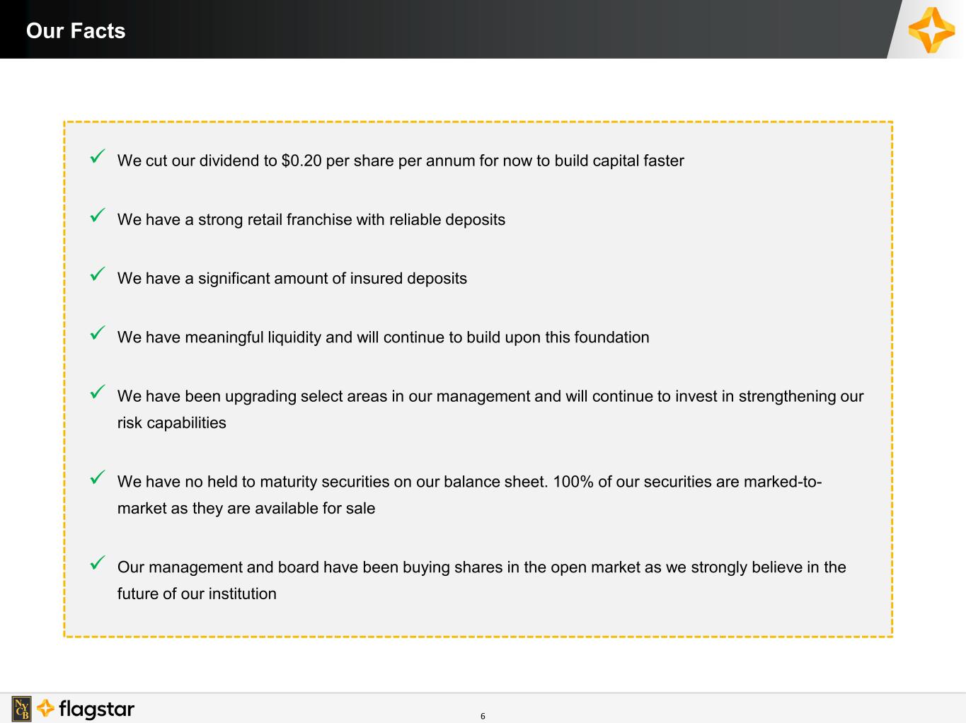 Our Facts  We cut our dividend to $0.20 per share per annum for now to build capital faster  We have a strong retail franchise with reliable deposits  We have a significant amount of insured deposits  We have meaningful liquidity and will continue to build upon this foundation  We have been upgrading select areas in our management and will continue to invest in strengthening our risk capabilities  We have no held to maturity securities on our balance sheet. 100% of our securities are marked-to- market as they are available for sale  Our management and board have been buying shares in the open market as we strongly believe in the future of our institution 6
