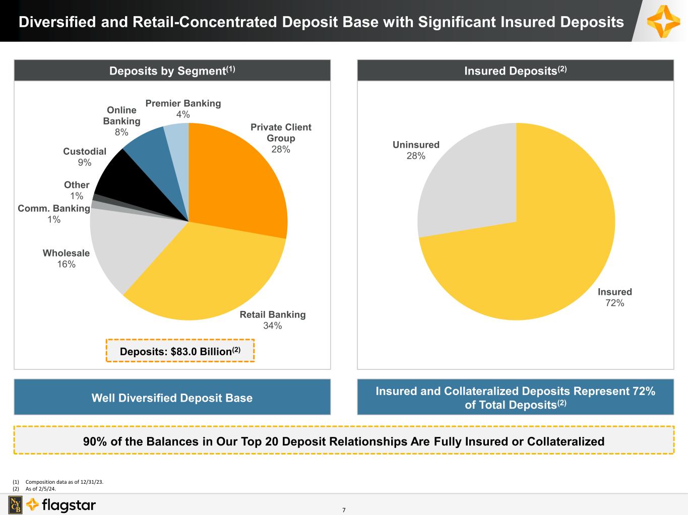 Diversified and Retail-Concentrated Deposit Base with Significant Insured Deposits Insured Deposits(2)Deposits by Segment(1) (1) Composition data as of 12/31/23. (2) As of 2/5/24. Well Diversified Deposit Base Insured and Collateralized Deposits Represent 72% of Total Deposits(2) Insured 72% Uninsured 28% Private Client Group 28% Retail Banking 34% Wholesale 16% Other 1% Comm. Banking 1% Custodial 9% Online Banking 8% Premier Banking 4% 90% of the Balances in Our Top 20 Deposit Relationships Are Fully Insured or Collateralized Deposits: $83.0 Billion(2) 7