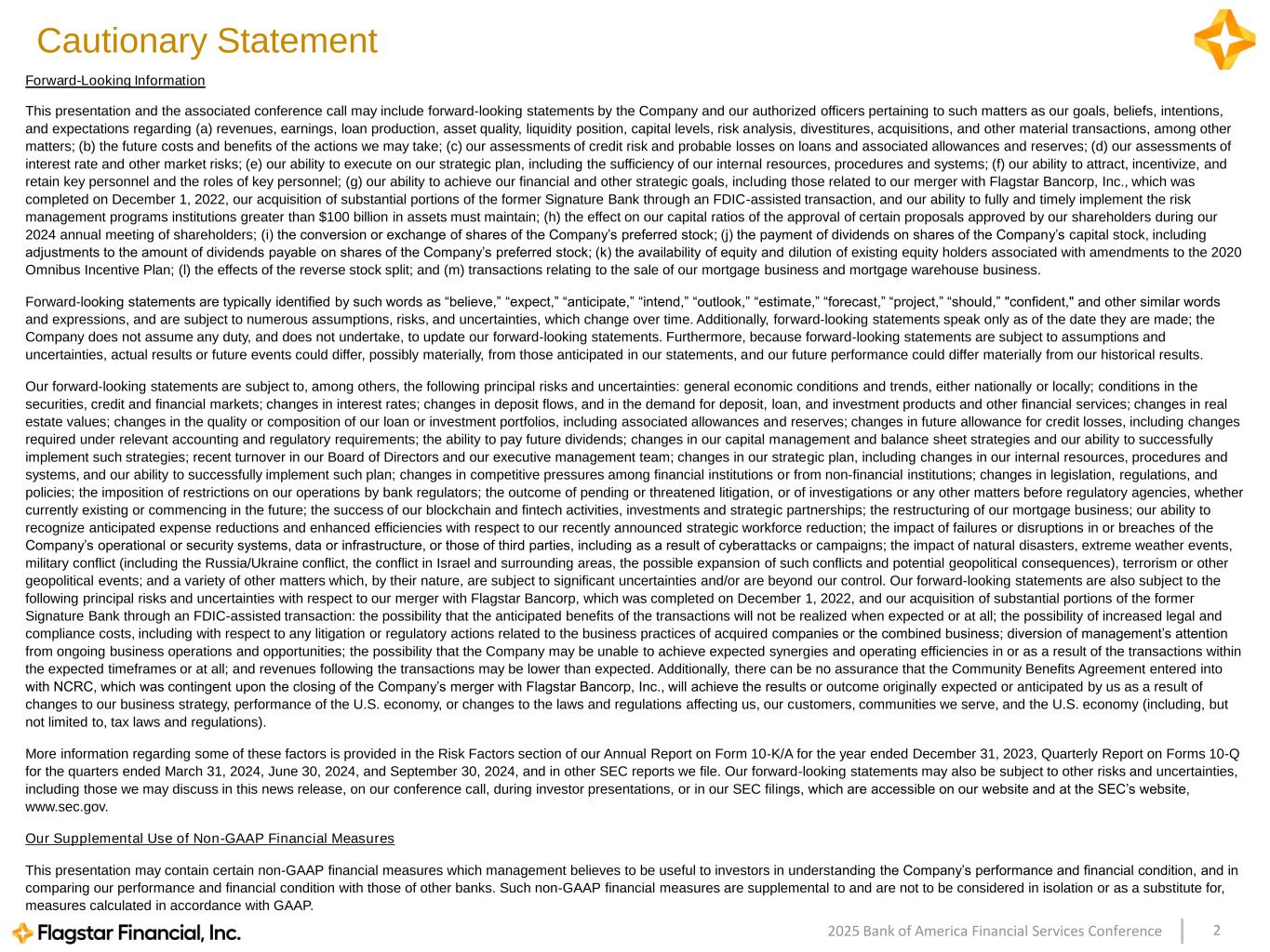 22025 Bank of America Financial Services Conference Cautionary Statement Forward-Looking Information This presentation and the associated conference call may include forward‐looking statements by the Company and our authorized officers pertaining to such matters as our goals, beliefs, intentions, and expectations regarding (a) revenues, earnings, loan production, asset quality, liquidity position, capital levels, risk analysis, divestitures, acquisitions, and other material transactions, among other matters; (b) the future costs and benefits of the actions we may take; (c) our assessments of credit risk and probable losses on loans and associated allowances and reserves; (d) our assessments of interest rate and other market risks; (e) our ability to execute on our strategic plan, including the sufficiency of our internal resources, procedures and systems; (f) our ability to attract, incentivize, and retain key personnel and the roles of key personnel; (g) our ability to achieve our financial and other strategic goals, including those related to our merger with Flagstar Bancorp, Inc., which was completed on December 1, 2022, our acquisition of substantial portions of the former Signature Bank through an FDIC-assisted transaction, and our ability to fully and timely implement the risk management programs institutions greater than $100 billion in assets must maintain; (h) the effect on our capital ratios of the approval of certain proposals approved by our shareholders during our 2024 annual meeting of shareholders; (i) the conversion or exchange of shares of the Company’s preferred stock; (j) the payment of dividends on shares of the Company’s capital stock, including adjustments to the amount of dividends payable on shares of the Company’s preferred stock; (k) the availability of equity and dilution of existing equity holders associated with amendments to the 2020 Omnibus Incentive Plan; (l) the effects of the reverse stock split; and (m) transactions relating to the sale of our mortgage business and mortgage warehouse business. Forward‐looking statements are typically identified by such words as “believe,” “expect,” “anticipate,” “intend,” “outlook,” “estimate,” “forecast,” “project,” “should,” "confident," and other similar words and expressions, and are subject to numerous assumptions, risks, and uncertainties, which change over time. Additionally, forward‐looking statements speak only as of the date they are made; the Company does not assume any duty, and does not undertake, to update our forward‐looking statements. Furthermore, because forward‐looking statements are subject to assumptions and uncertainties, actual results or future events could differ, possibly materially, from those anticipated in our statements, and our future performance could differ materially from our historical results. Our forward‐looking statements are subject to, among others, the following principal risks and uncertainties: general economic conditions and trends, either nationally or locally; conditions in the securities, credit and financial markets; changes in interest rates; changes in deposit flows, and in the demand for deposit, loan, and investment products and other financial services; changes in real estate values; changes in the quality or composition of our loan or investment portfolios, including associated allowances and reserves; changes in future allowance for credit losses, including changes required under relevant accounting and regulatory requirements; the ability to pay future dividends; changes in our capital management and balance sheet strategies and our ability to successfully implement such strategies; recent turnover in our Board of Directors and our executive management team; changes in our strategic plan, including changes in our internal resources, procedures and systems, and our ability to successfully implement such plan; changes in competitive pressures among financial institutions or from non‐financial institutions; changes in legislation, regulations, and policies; the imposition of restrictions on our operations by bank regulators; the outcome of pending or threatened litigation, or of investigations or any other matters before regulatory agencies, whether currently existing or commencing in the future; the success of our blockchain and fintech activities, investments and strategic partnerships; the restructuring of our mortgage business; our ability to recognize anticipated expense reductions and enhanced efficiencies with respect to our recently announced strategic workforce reduction; the impact of failures or disruptions in or breaches of the Company’s operational or security systems, data or infrastructure, or those of third parties, including as a result of cyberattacks or campaigns; the impact of natural disasters, extreme weather events, military conflict (including the Russia/Ukraine conflict, the conflict in Israel and surrounding areas, the possible expansion of such conflicts and potential geopolitical consequences), terrorism or other geopolitical events; and a variety of other matters which, by their nature, are subject to significant uncertainties and/or are beyond our control. Our forward-looking statements are also subject to the following principal risks and uncertainties with respect to our merger with Flagstar Bancorp, which was completed on December 1, 2022, and our acquisition of substantial portions of the former Signature Bank through an FDIC-assisted transaction: the possibility that the anticipated benefits of the transactions will not be realized when expected or at all; the possibility of increased legal and compliance costs, including with respect to any litigation or regulatory actions related to the business practices of acquired companies or the combined business; diversion of management’s attention from ongoing business operations and opportunities; the possibility that the Company m